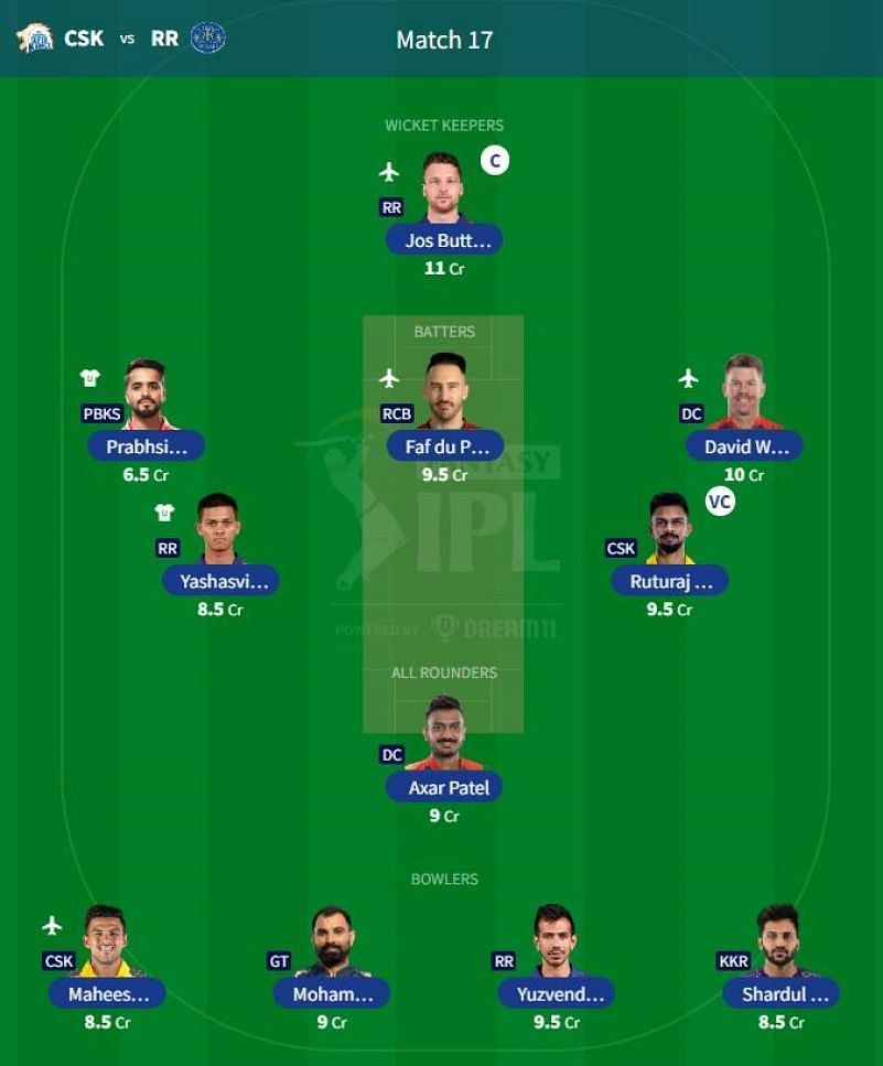 Players playing in Match 17: Yuzvendra Chahal (BOWL) (RR) (9.5 Credits), Jos Buttler (WK) (RR) (11 Credits), Ruturaj Gaikwad (BAT) (CSK) (9.5 Credits), Mahesh Theekshana (BOWL) (CSK) (8.5 Credits), and Yashasvi Jaiswal (BAT) (RR) (8.5 Credits).