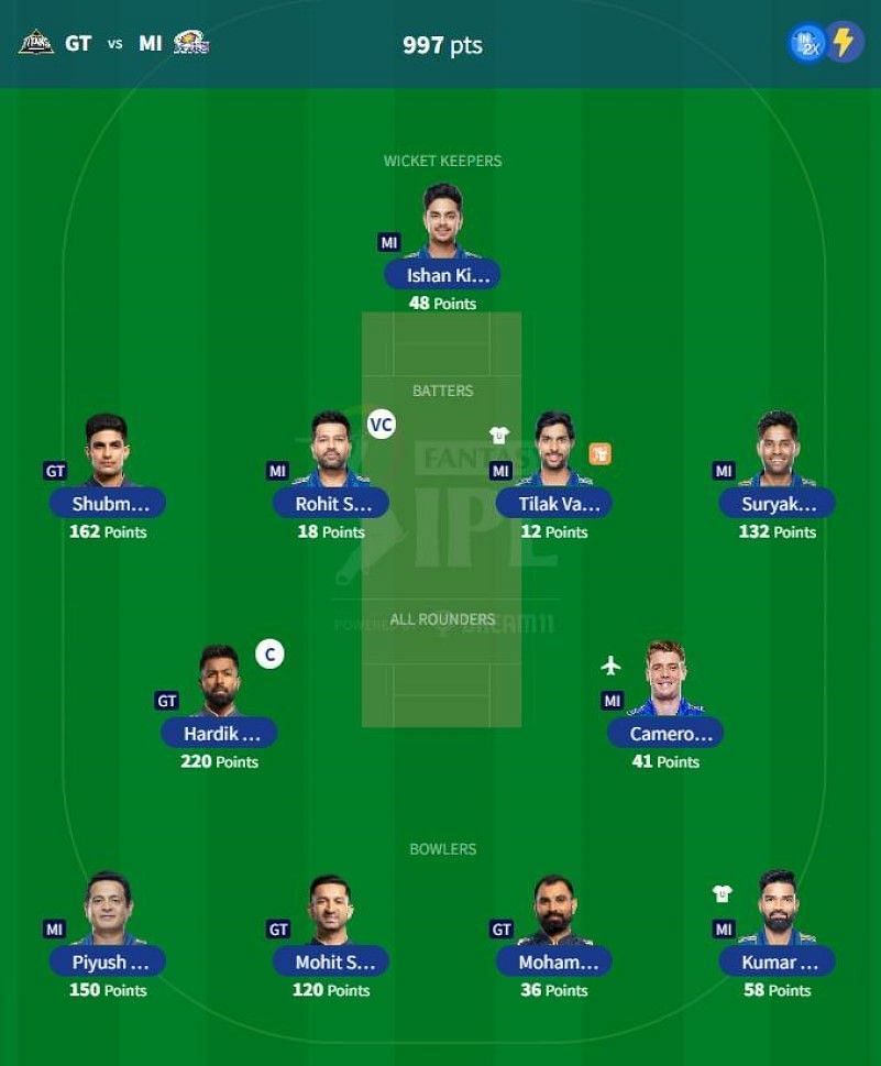 Players playing in Match 35: Cameron Green (ALL) (MI) (9 Credits), Tilak Varma (BAT) (MI) (8.5 Credits), Hardik Pandya (ALL) (GT) (11 Credits), Mohammed Shami (GT) (BOWL) (9 Credits), Piyush Chawla (BOWL) (MI) (7 Credits), Kumar Karthikeya (BOWL) (MI) (7.5 Credits), Suryakumar Yadav (BAT) (MI) (10 Credits), Mohit Sharma (BOWL) (GT) (7.5 Credits), Rohit Sharma (BAT) (MI) (11 Credits), Shubman Gill (BAT) (GT) (9.5 Credits), and Ishan Kishan (WK) (MI) (9 Credits).