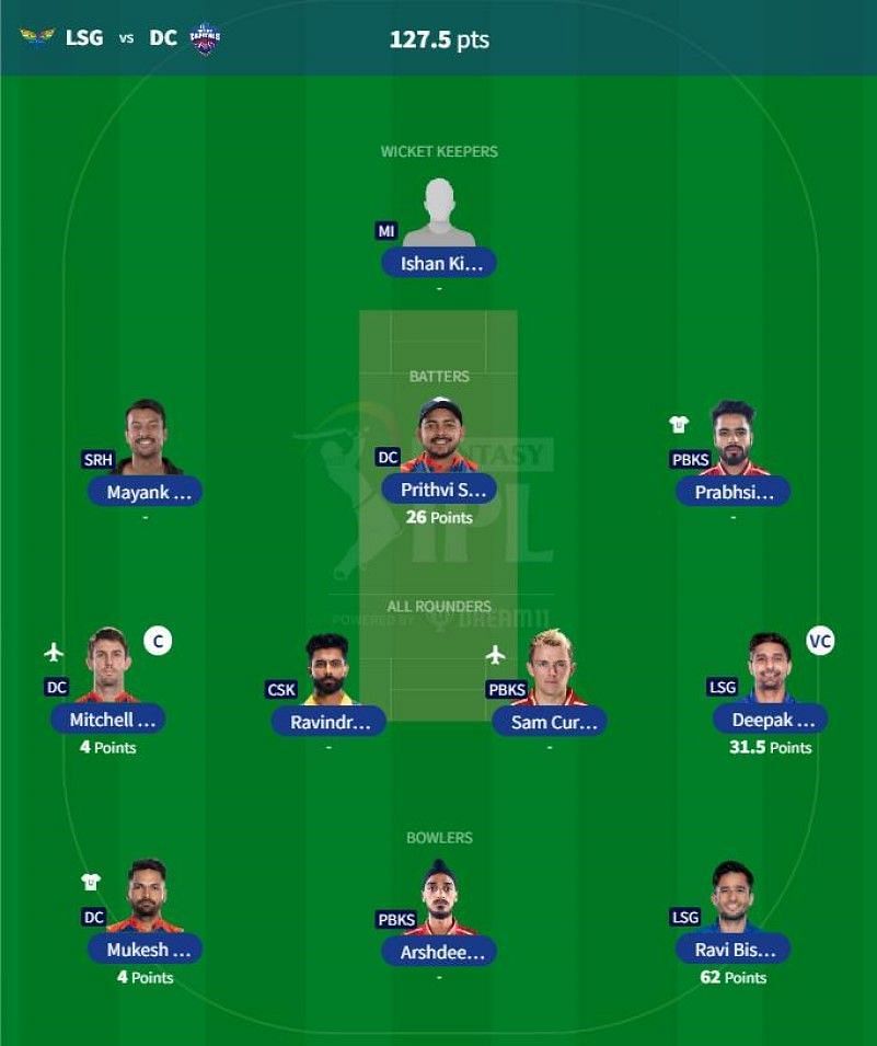 I made a couple of changes to my playing XI ahead of the Lucknow Super Giants-Delhi Capitals game, but they didn't have much effect on my final score for the match. I brought in Mitchell Marsh and Mukesh Kumar instead of Kuldeep Yadav and Sarfaraz Khan.