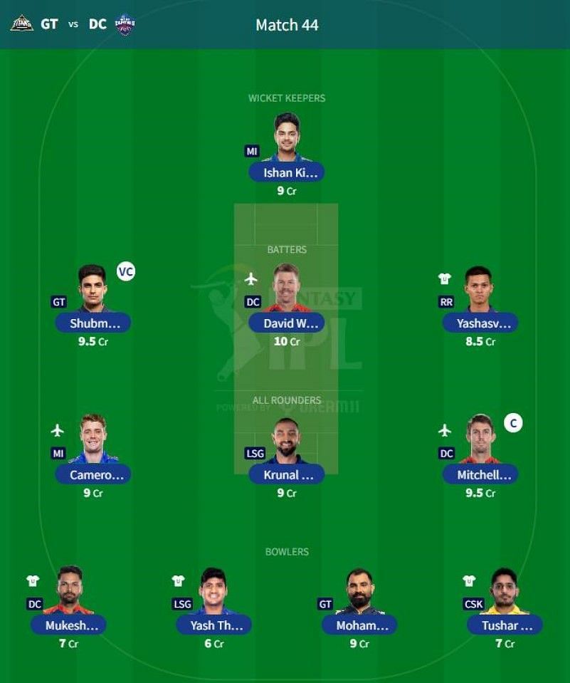Players playing in Match 44: Mukesh Kumar (BOWL) (DC) (7 Credits), David Warner (BAT) (DC) (10 Credits), Mohammed Shami (GT) (BOWL) (9 Credits), Shubman Gill (BAT) (GT) (9.5 Credits), and Mitchell Marsh (ALL) (DC) (9.5 Credits).