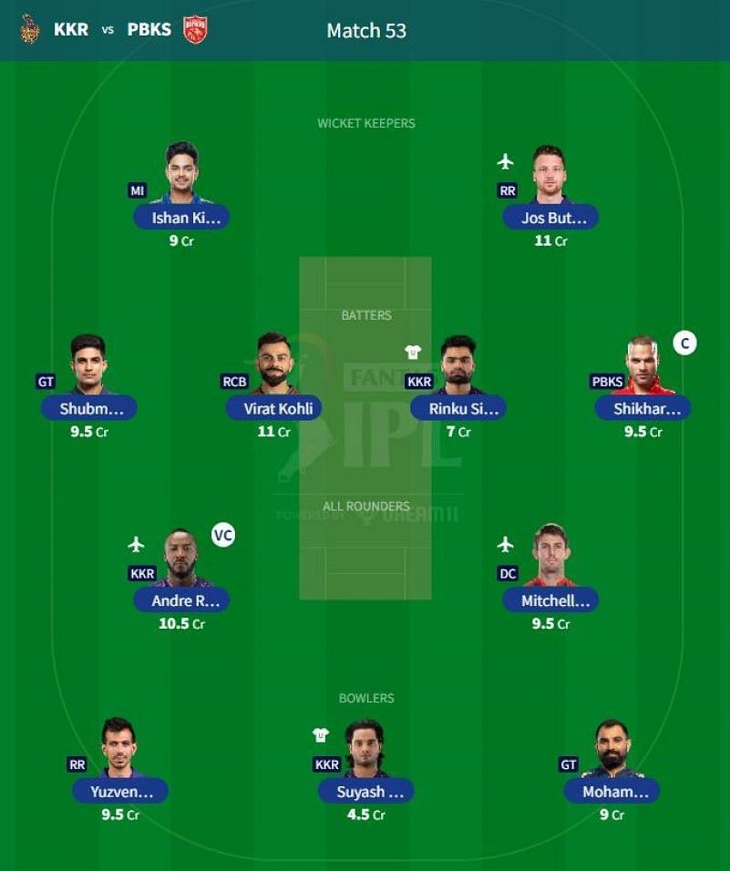 Players playing in Match 53: Suyash Sharma (BOWL) (KKR) (4.5 Credits), Rinku Singh (BAT) (KKR) (7 Credits), Andre Russell (ALL) (KKR) (10.5 Credits), and Shikhar Dhawan (BAT) (PBKS) (9.5 Credits).