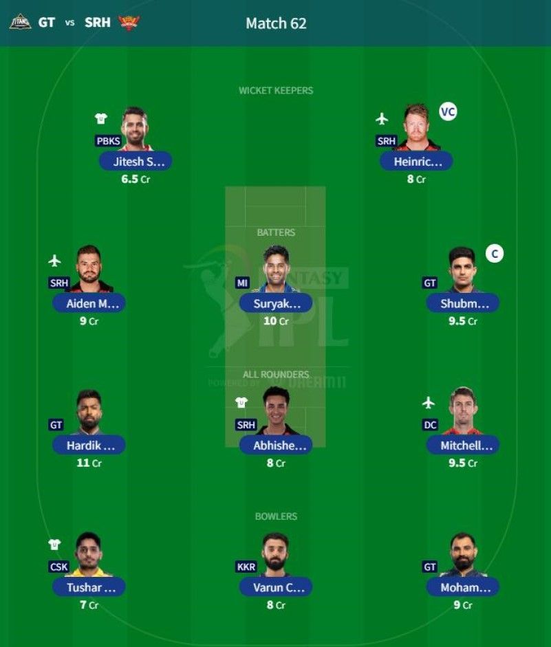 Players playing in Match 62: Abhishek Sharma (ALL) (SRH) (8 Credits), Heinrich Klaasen (WK) (SRH) (8 Credits), Aiden Markram (BAT) (SRH) (9 Credits), Mohammed Shami (GT) (BOWL) (9 Credits), Shubman Gill (BAT) (GT) (9.5 Credits), and Hardik Pandya (ALL) (GT) (11 Credits).
