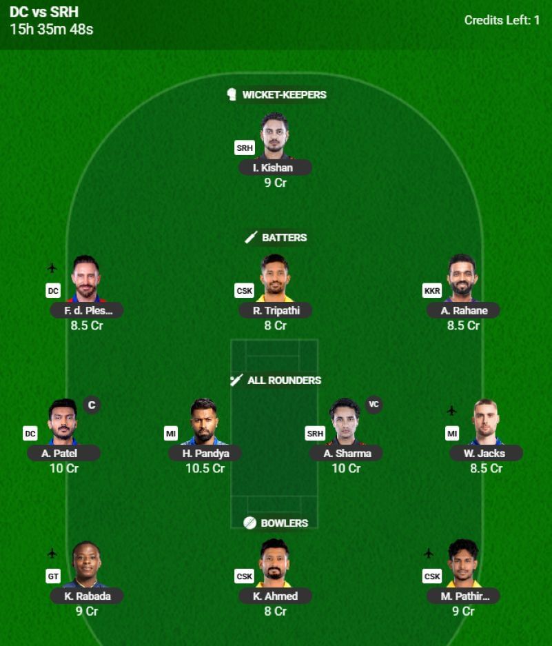 Players playing in Match 10: Ishan Kishan (SRH) (WK) (9 Credits), Abhishek Sharma (SRH) (ALL) (10 Credits), Faf du Plessis (DC) (BAT) (9.5 Credits), and Axar Patel (DC) (ALL) (10 Credits).