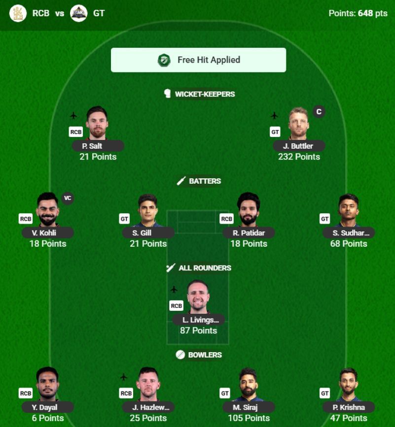 I chose to use the Free Hit Booster to put out a full XI of players for RCB's clash against GT, with the decision to captain Jos Buttler making it a decent outcome in the end.