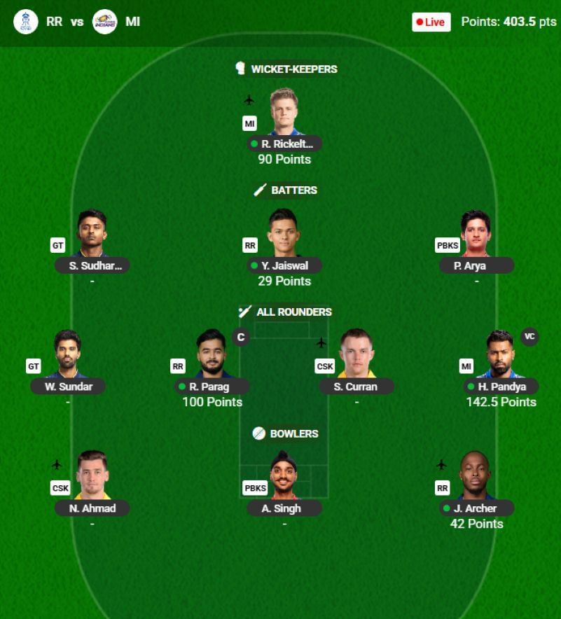 Captain: Riyan Parag. | Vice-Captain: Hardik Pandya.