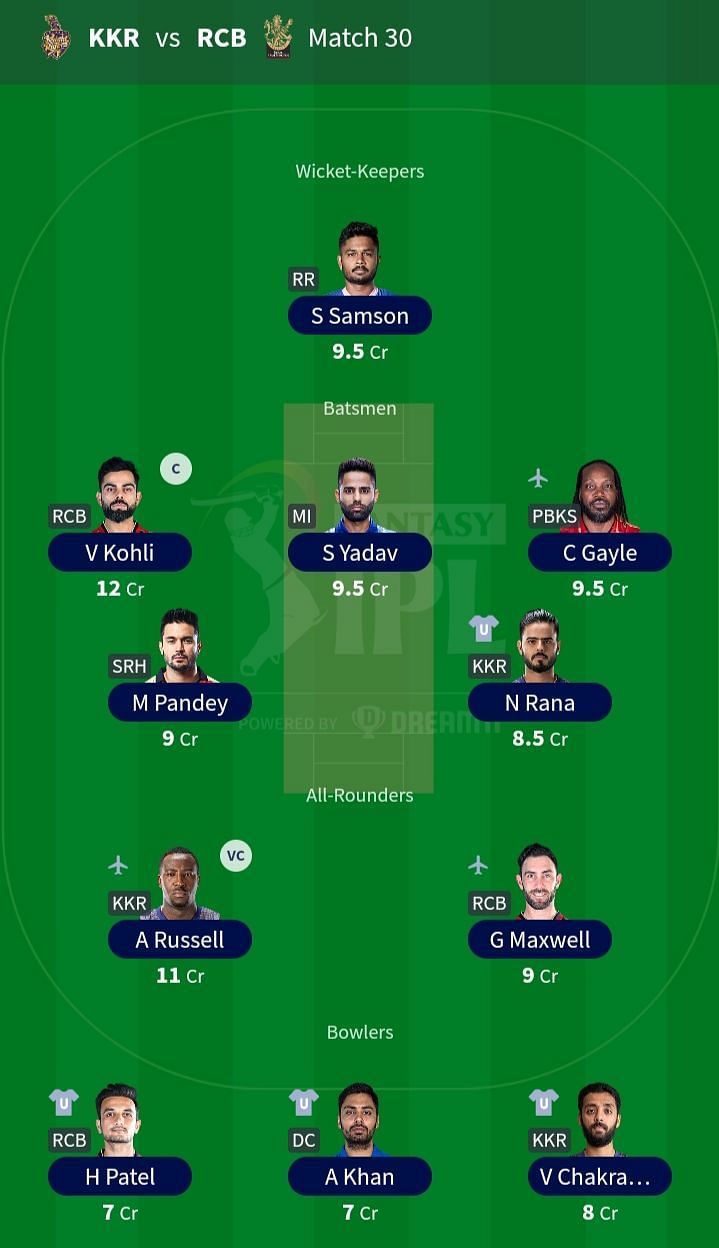 Best IPL Fantasy Team for Match 30 - KKR vs RCB