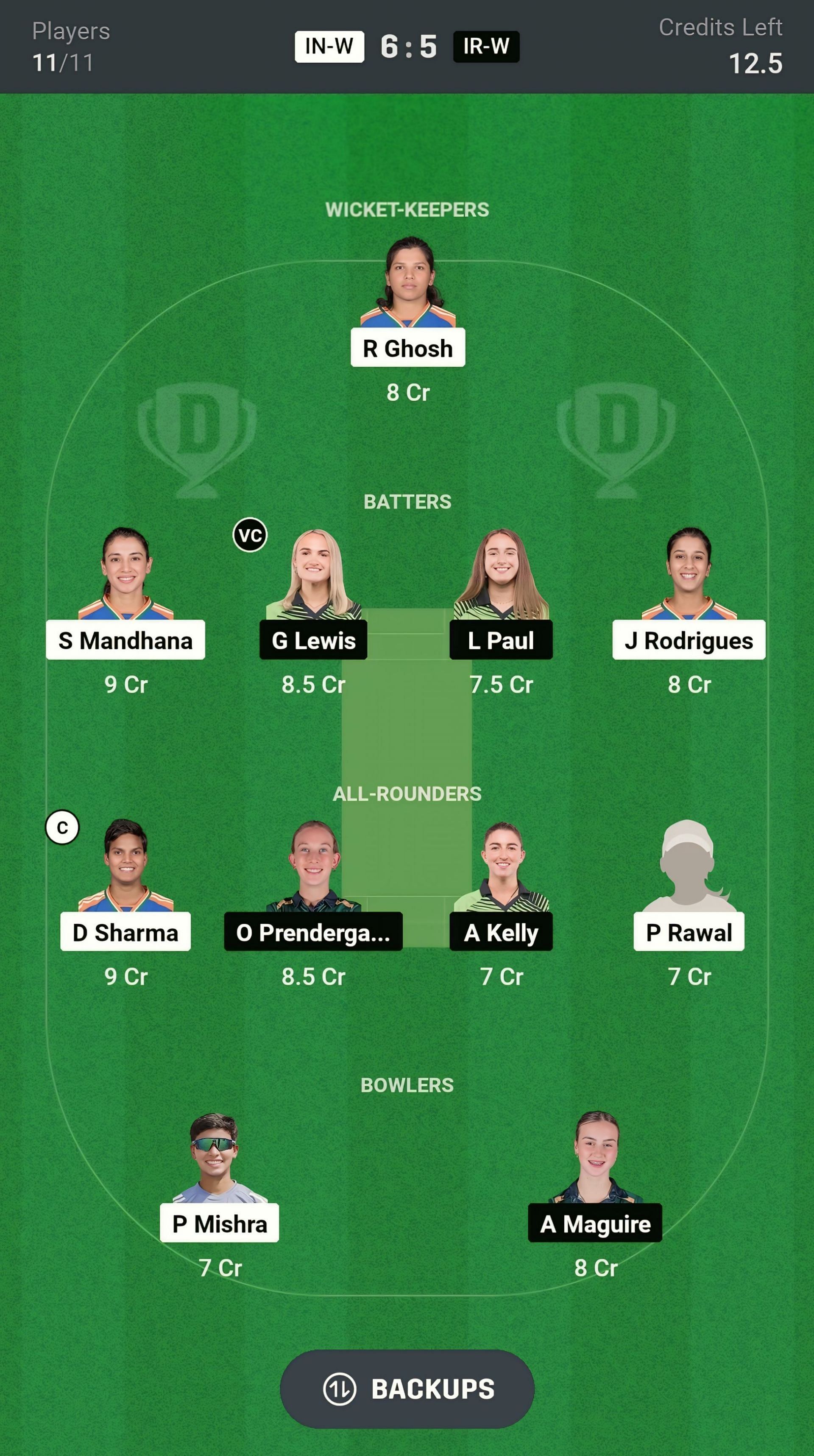 Deepti Sharma and Pratika Rawal are the best all-rounder picks for the Dream11 team. Both will play a crucial role for their teams in today's match. Rawal smashed 89 runs in the last match. Orla Prendergast is another good all-rounder for today's match.