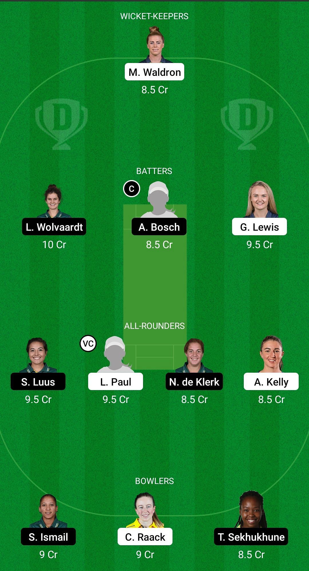 Fantasy Suggestion #1: Mary Waldron, Laura Wolvaardt, Anneke Bosch, Gaby Lewis, Sune Luus, Leah Paul, Nadine de Klerk, Arlene Kelly, Shabnim Ismail, Celeste Raack, Tumi Sekhukhune.