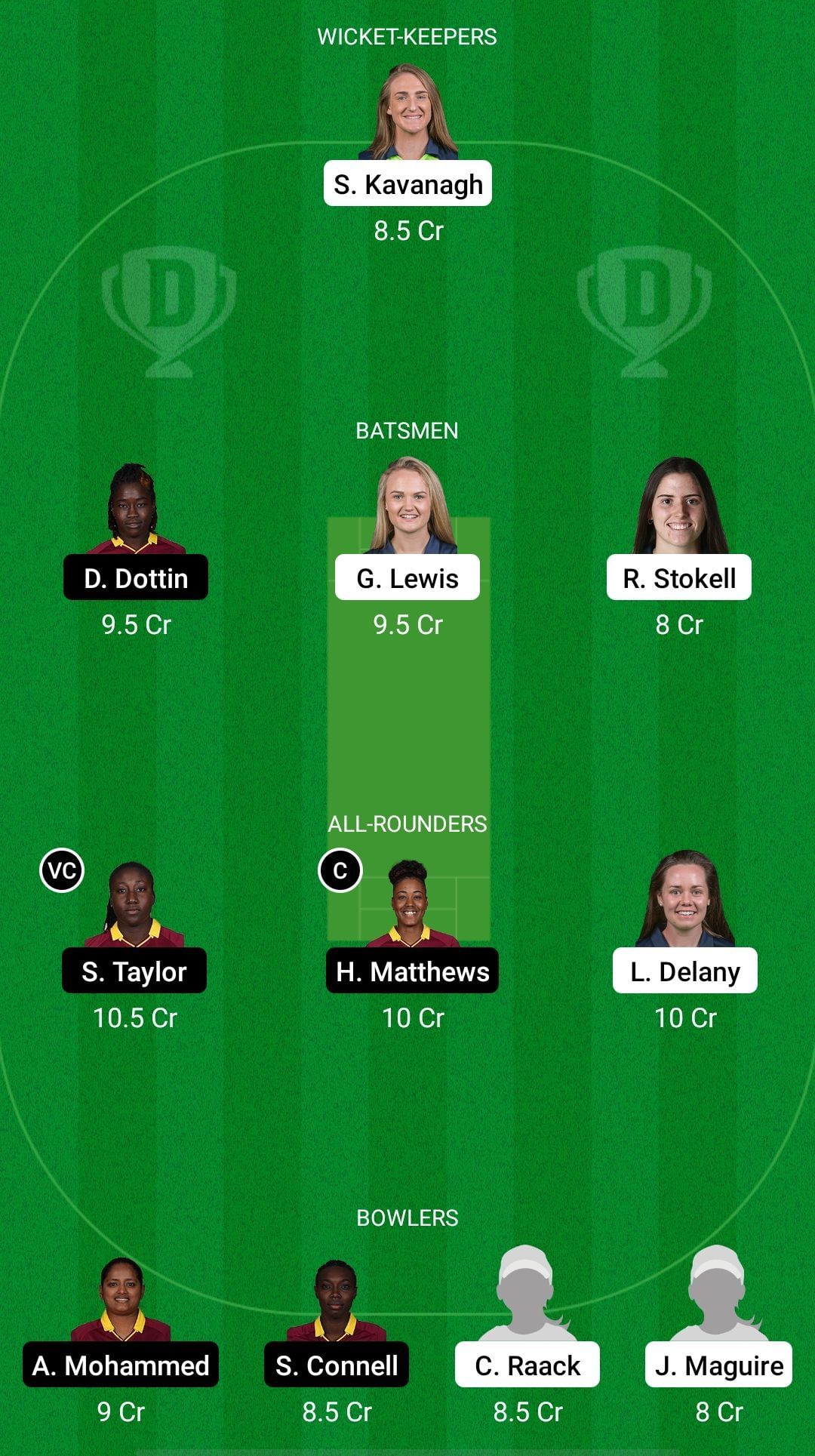 Fantasy Suggestion #1: Shauna Kavanagh, Deandra Dottin, Gaby Lewis, Rebecca Stokell, Stafanie Taylor, Hayley Matthews, Laura Delany, Anisa Mohammed, Shamilia Connell, Jane Maguire, Celeste Raack.