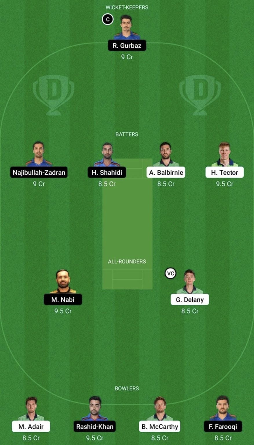 Fantasy Suggestion #2: Rahmanullah Gurbaz, Andy Balbirnie, Najibullah Zadran, Hashmatullah Shahidi, Harry Tector, Mohammad Nabi, Gareth Delany, Mark Adair, Barry McCarthy, Fazalhaq Farooqi and Rashid Khan.