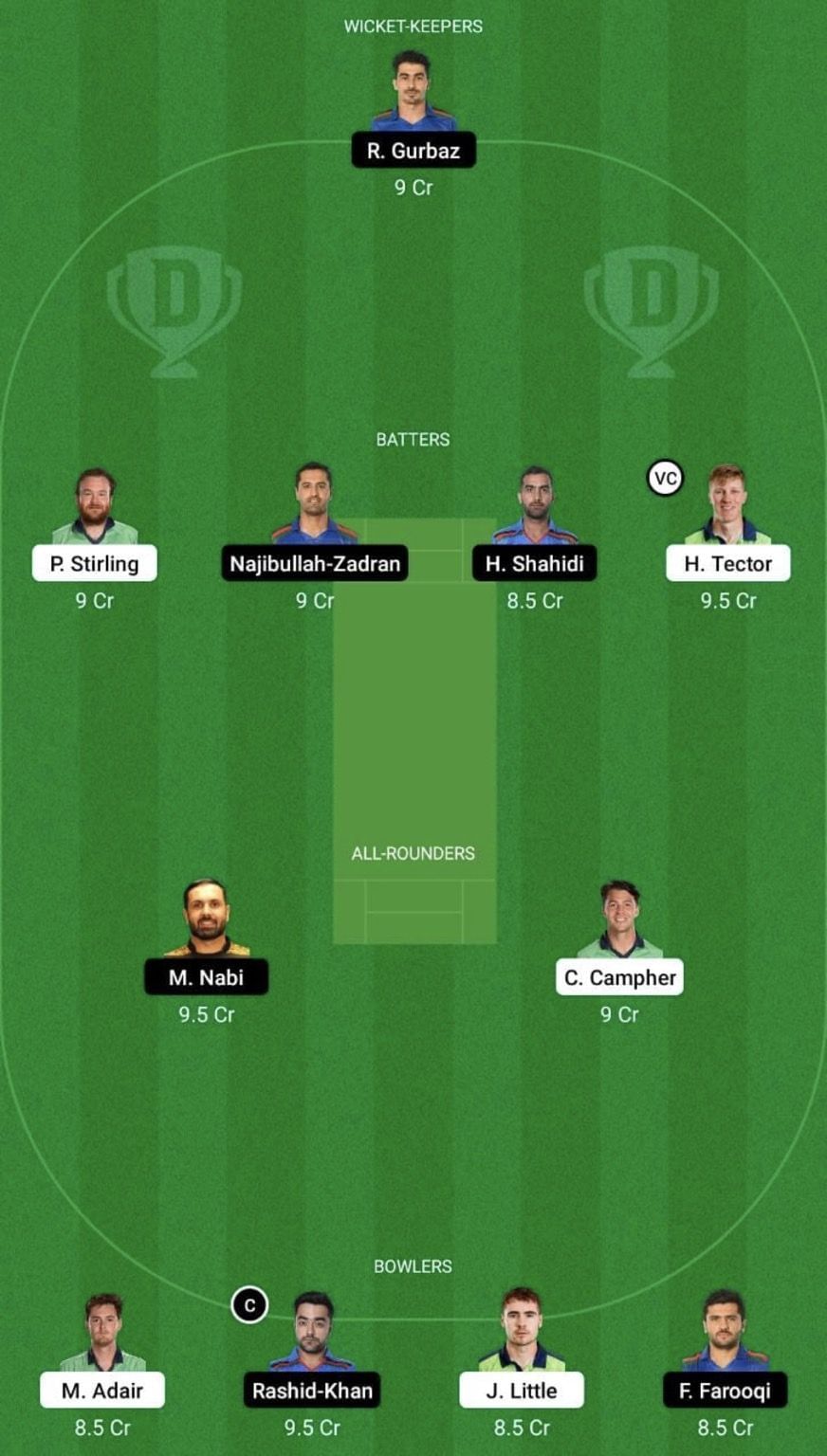 Fantasy Suggestion #1: Rahmanullah Gurbaz, Paul Stirling, Najibullah Zadran, Hashmatullah Shahidi, Harry Tector, Mohammad Nabi, Curtis Campher, Mark Adair, Josh Little, Fazalhaq Farooqi and Rashid Khan.