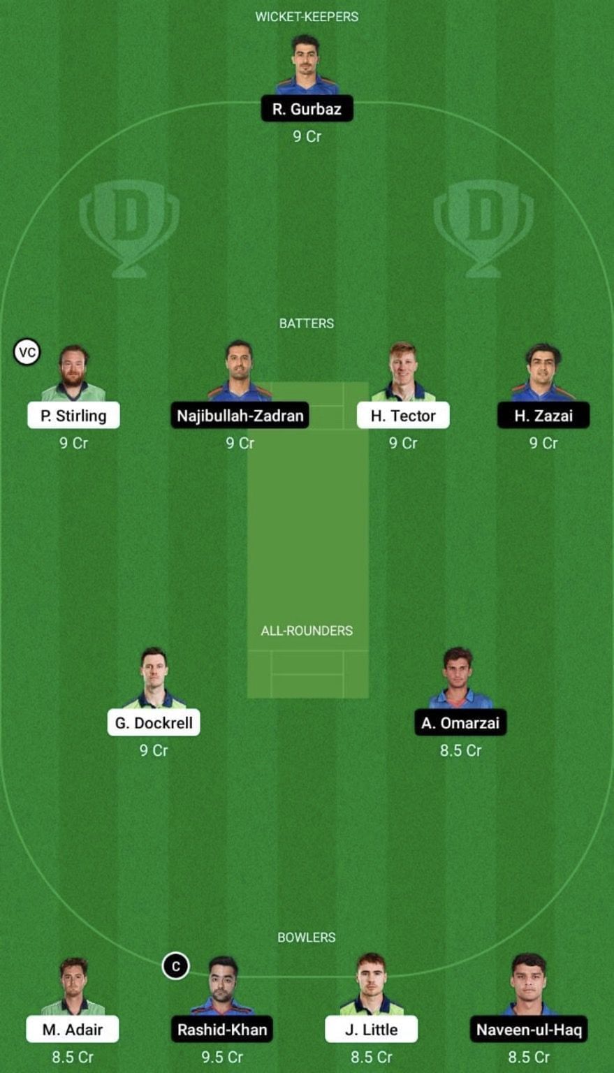 Fantasy Suggestion #1: Rahmanullah Gurbaz, Paul Stirling, Najibullah Zadran, Harry Tector, Hazratullah Zazai, George Dockrell, Azmatullah Omarzai, Mark Adair, Rashid Khan, Josh Little and Naveen-ul-Haq.
