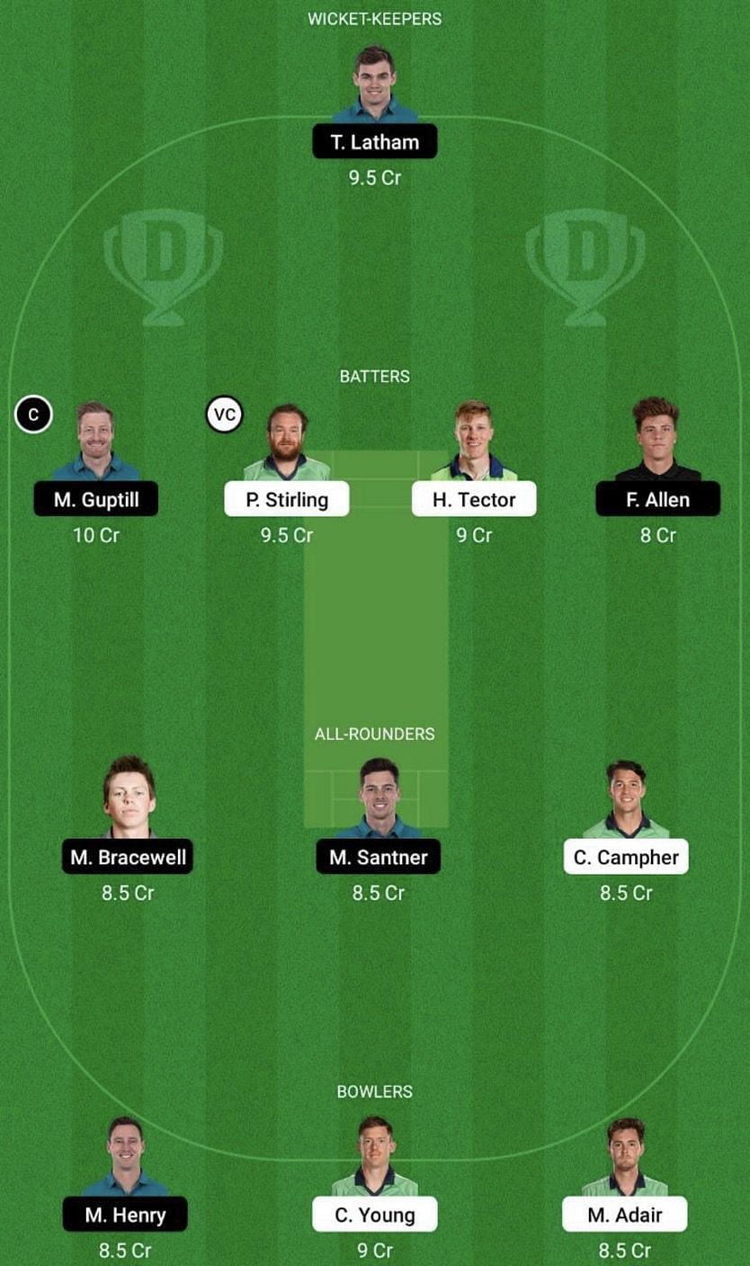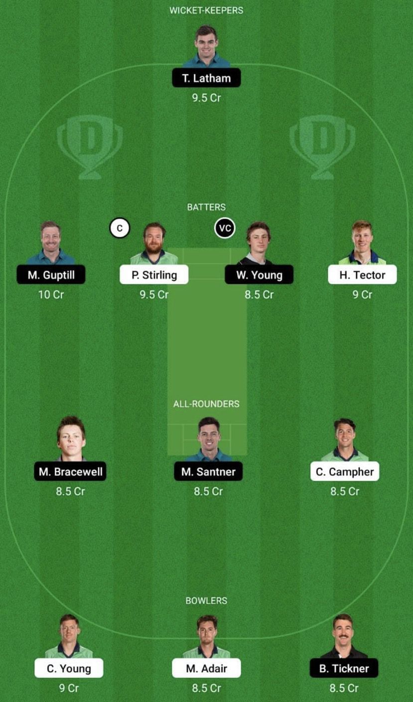Fantasy Suggestion #1: Tom Latham, Martin Guptill, Paul Stirling, Harry Tector, Finn Allen, Michael Bracewell, Mitchell Santner, Curtis Campher, Matt Henry, Craig Young and Mark Adair.