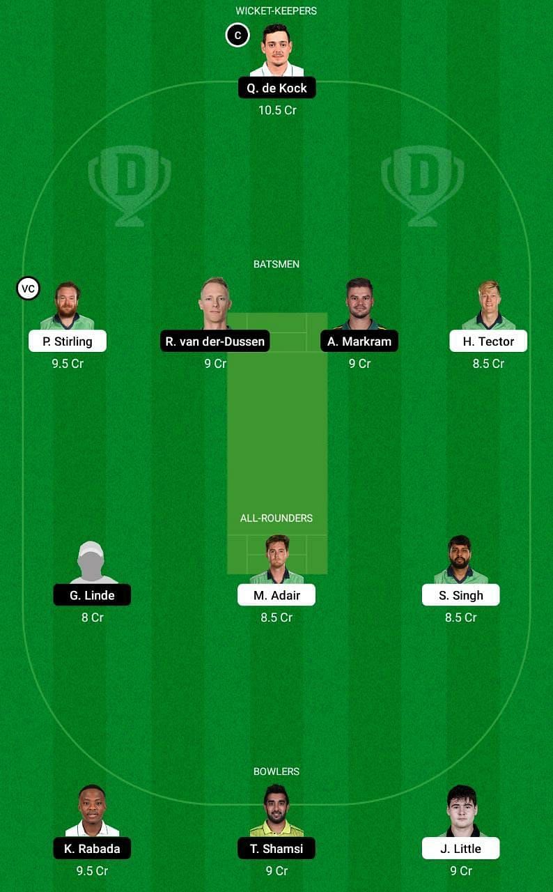 Fantasy Suggestion #1: Quinton de Kock, Paul Stirling, Rassie van der Dussen, Aiden Markram, Harry Tector, George Linde, Mark Adair, Simi Singh, Kagiso Rabada, Tabraiz Shamsi and Josh Little