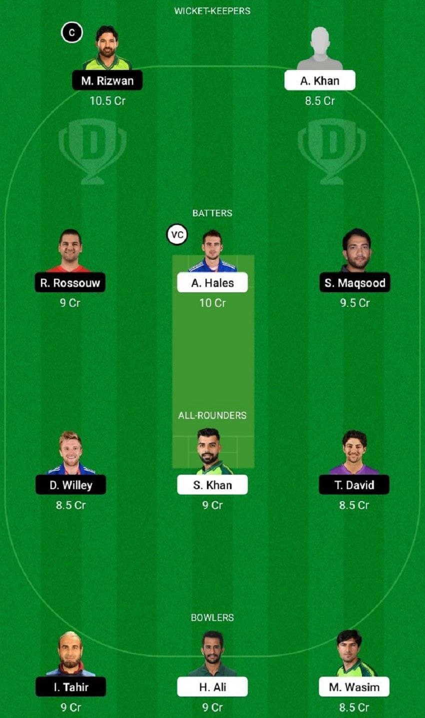 Mohammad Rizwan (c&wk), Shan Masood, Sohaib Maqsood, Rilee Rossouw, Tim David, Khushdil Shah, David Willey, Imran Khan, Imran Tahir, Shahnawaz Dahani and Ihsanullah/Abbas Afridi