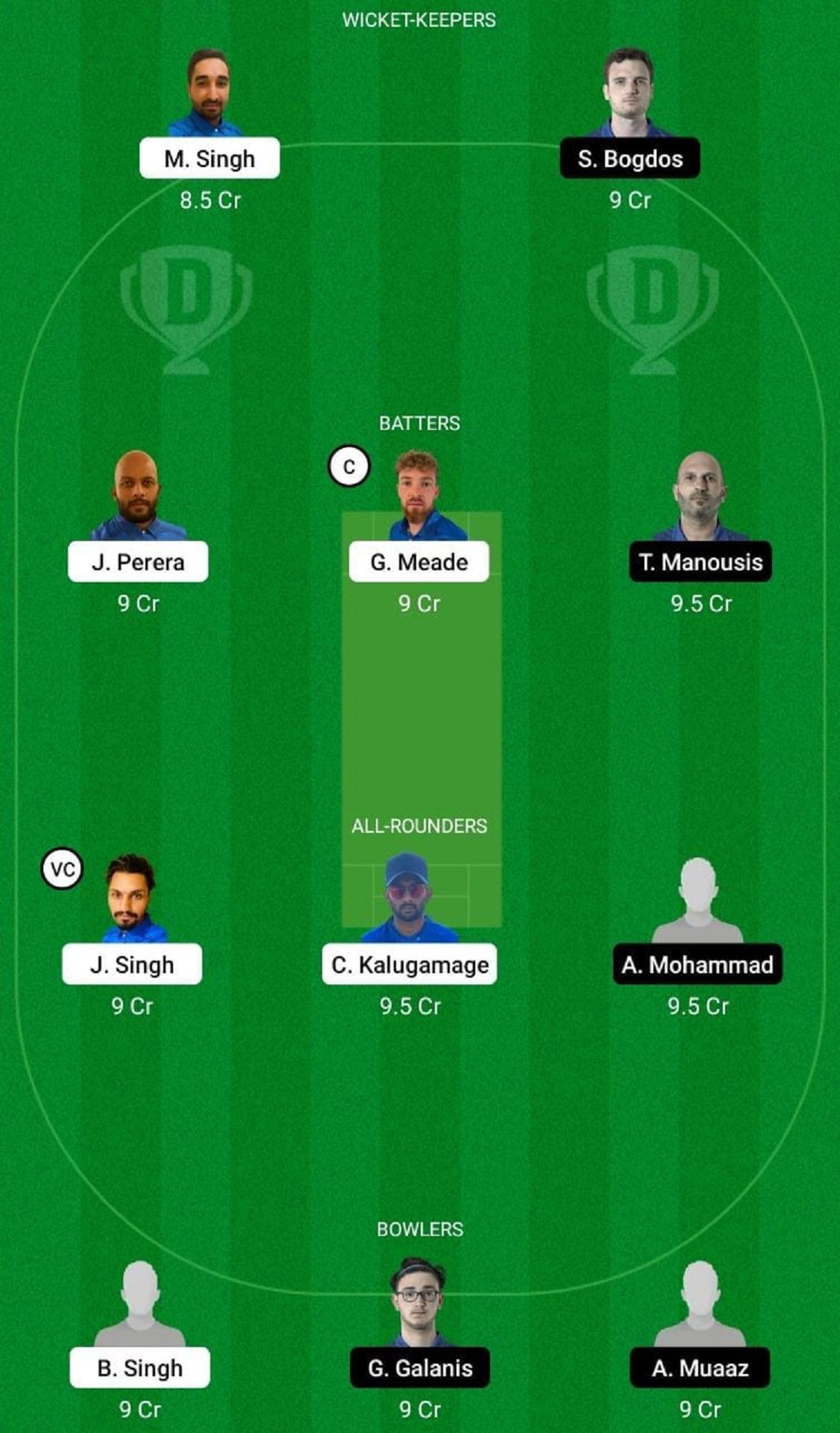 Fantasy Suggestion #1: S Bogdos, G Meade, J Perera, T Manousis, A Mohammad, C Kalugamage, J Singh, A Muaaz, B Singh, G Galanis, S Singh.