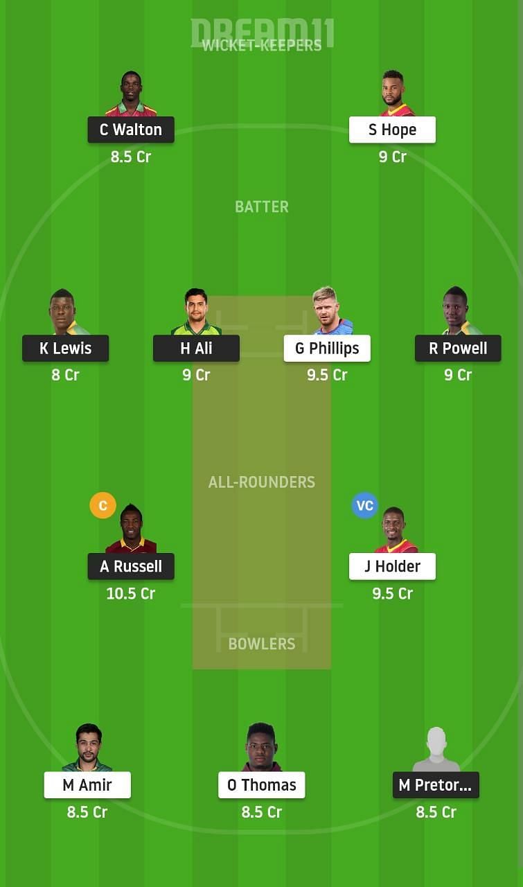 Fantasy Suggestion #2: Chadwick Walton, Kennar Lewis, Haider Ali, Glenn Phillips, Rovman Powell, Andre Russell, Carlos Brathwaite, Jason Holder, Oshane Thomas, Mohammad Amir, Migael Pretorius