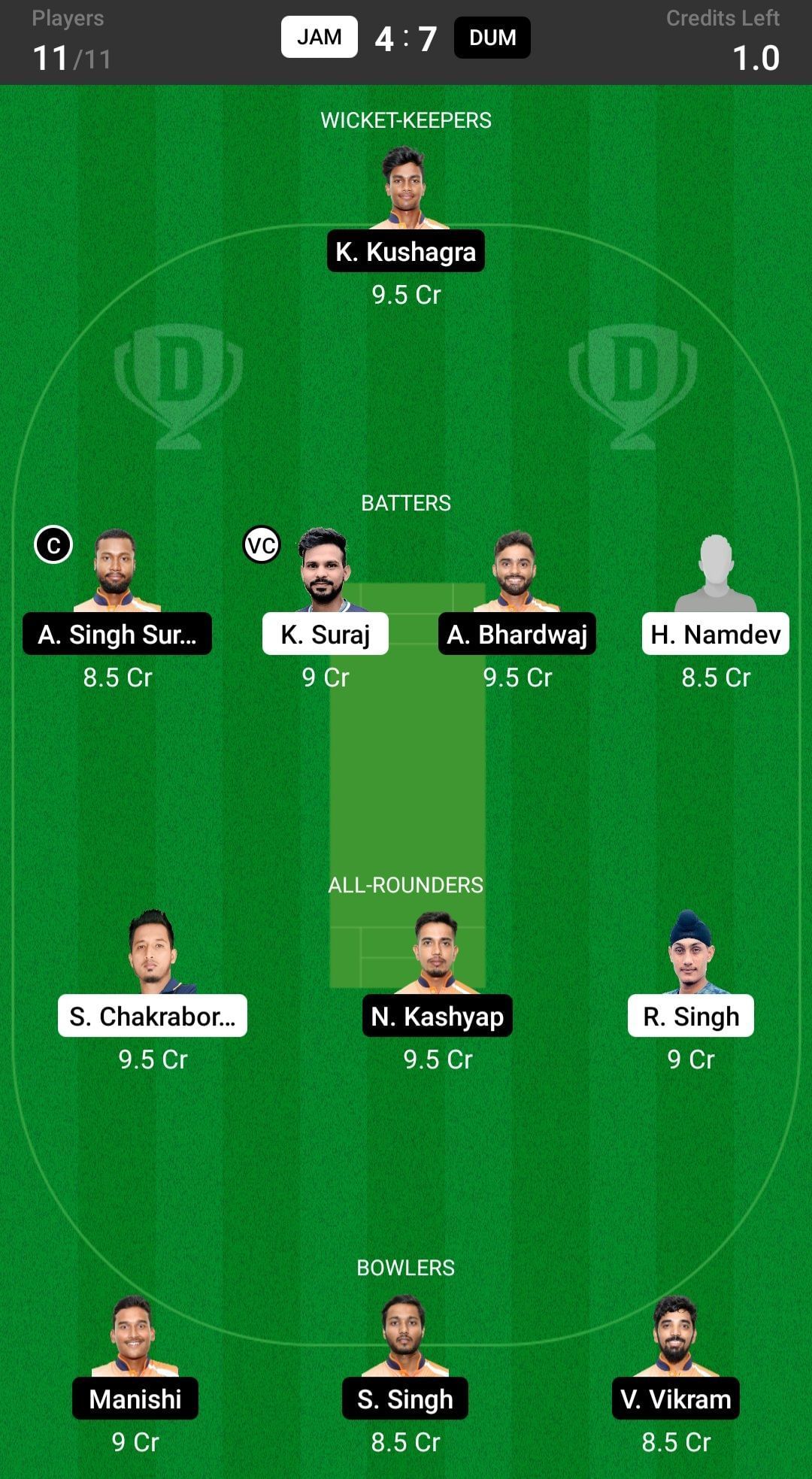Fantasy suggestion #2: K Kushagra, H Namdev, A Singh, A Bhardwaj, K Suraj, S Chakraborty, R Singh, N Kashyap, Manishi, S Singh, V Vikram
