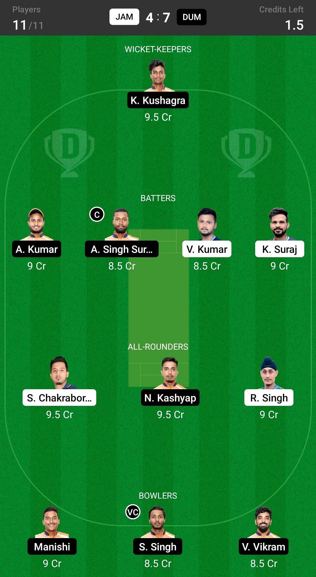 Fantasy suggestion #1: K Kushagra, A Kumar, A Singh, V Kumar, K Suraj, S Chakraborty, R Singh, N Kashyap, Manishi, S Singh, V Vikram