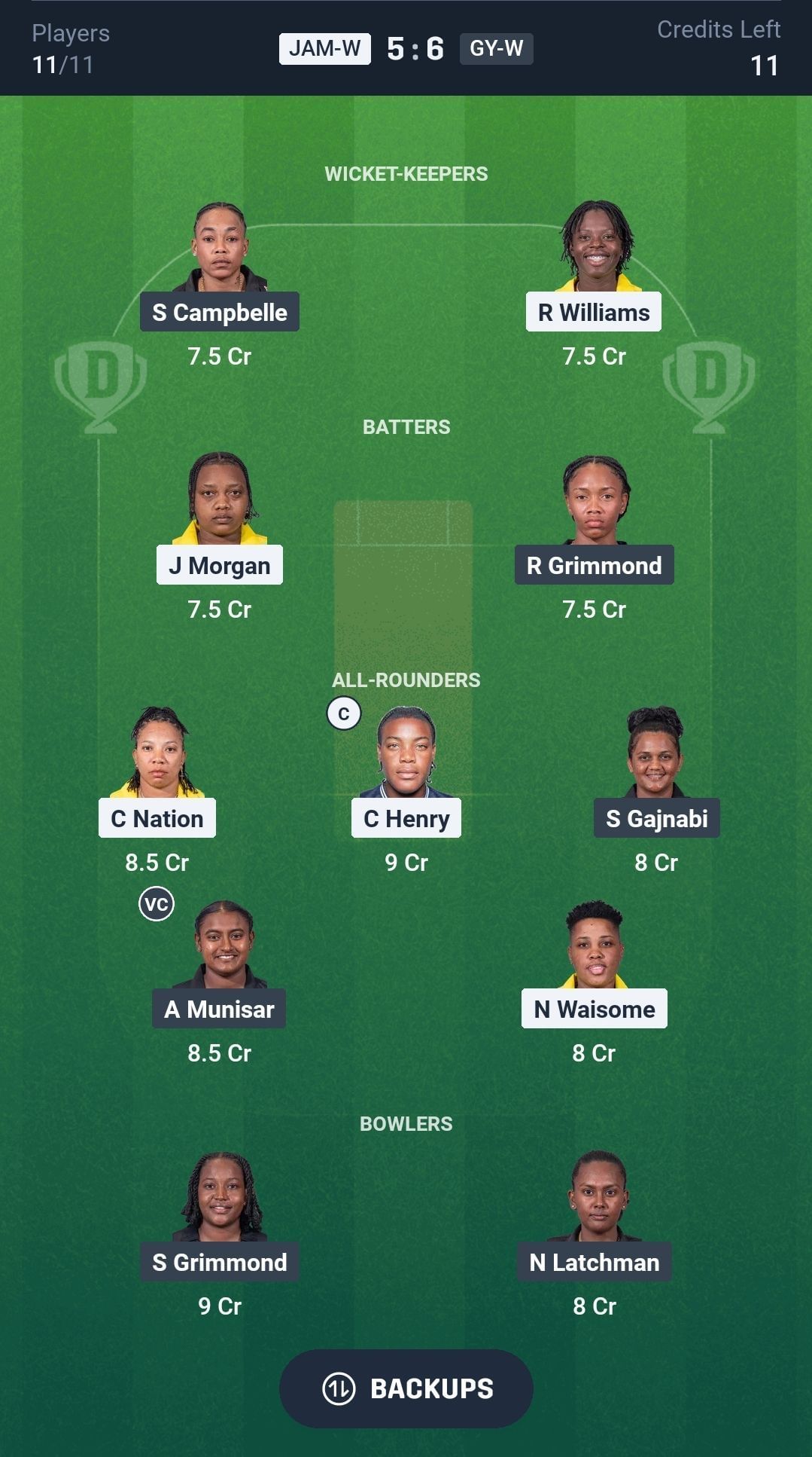 C Henry and A Munisar are the best all-rounder picks for the Dream11 team. Both will play a crucial role for their teams in today's match. C Henry will bat in the top order and complete her quota of overs. She has taken five wickets and smashed 185 runs in the last five matches. C Nation is another good all-rounder for today's match.