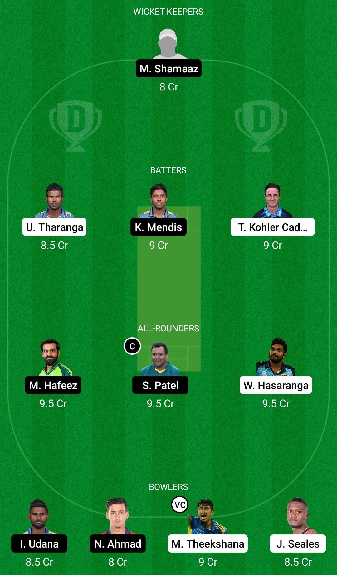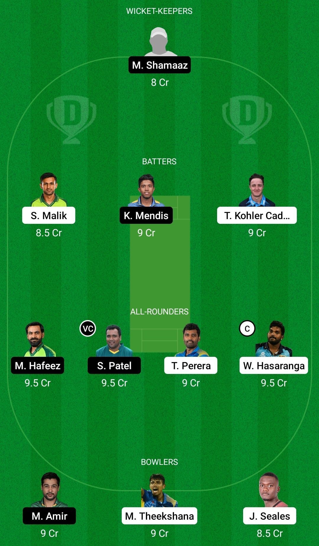 Fantasy Suggestion #1: Mohammed Shamaaz, Shoaib Malik, Kusal Mendis, Tom Kohler-Cadmore, Mohammad Hafeez, Samit Patel, Thisara Perera, Wanindu Hasaranga, Mohammad Amir, Maheesh Theekshana, Jayden Seales.
