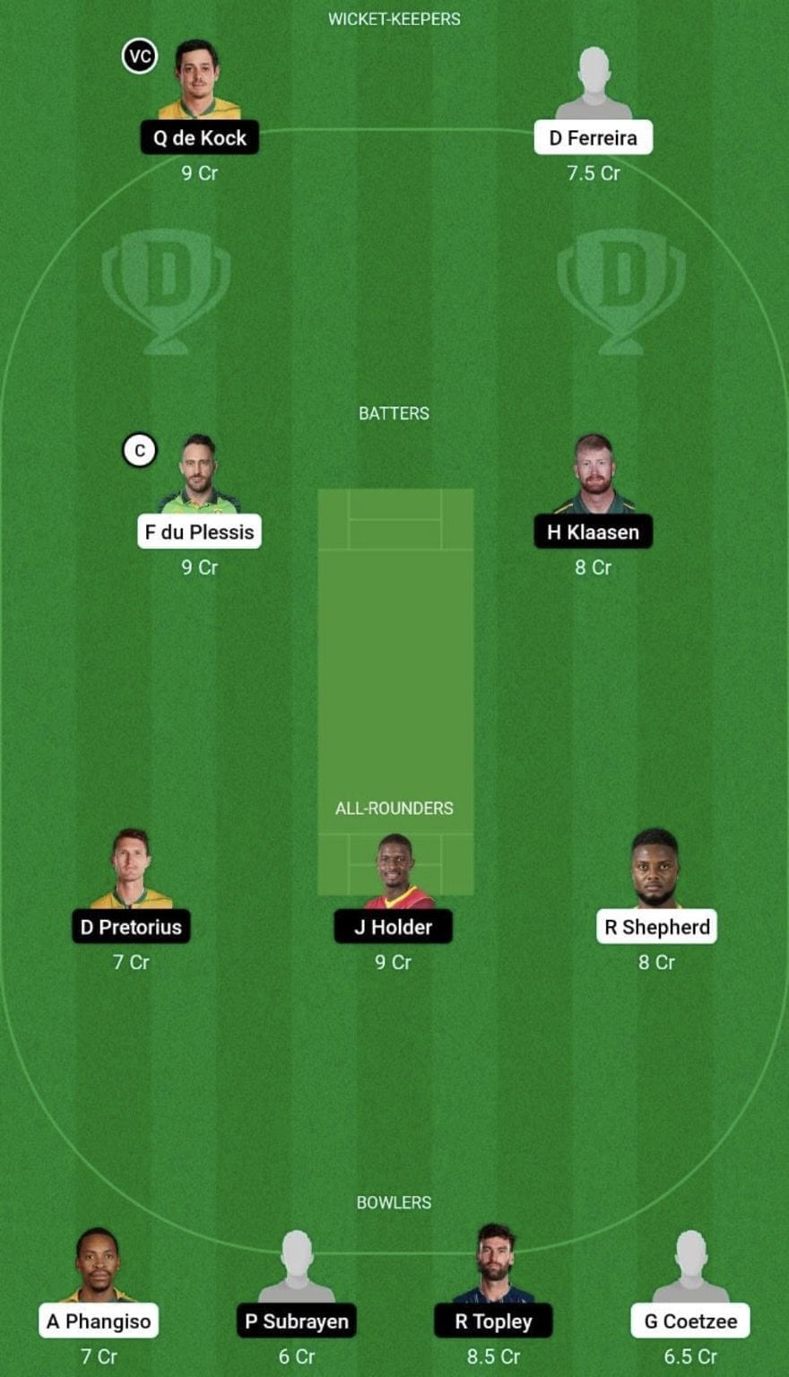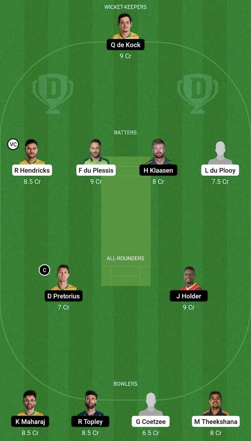 Quinton de Kock (c&wk), Kyle Mayers, Matthew Breetzke, Wiaan Mulder, Heinrich Klaasen, Dwaine Pretorius, Jason Holder, Prenelan Subrayen, Keshav Maharaj, Reece Topley and Junior Dala/Hardus Viljoen.