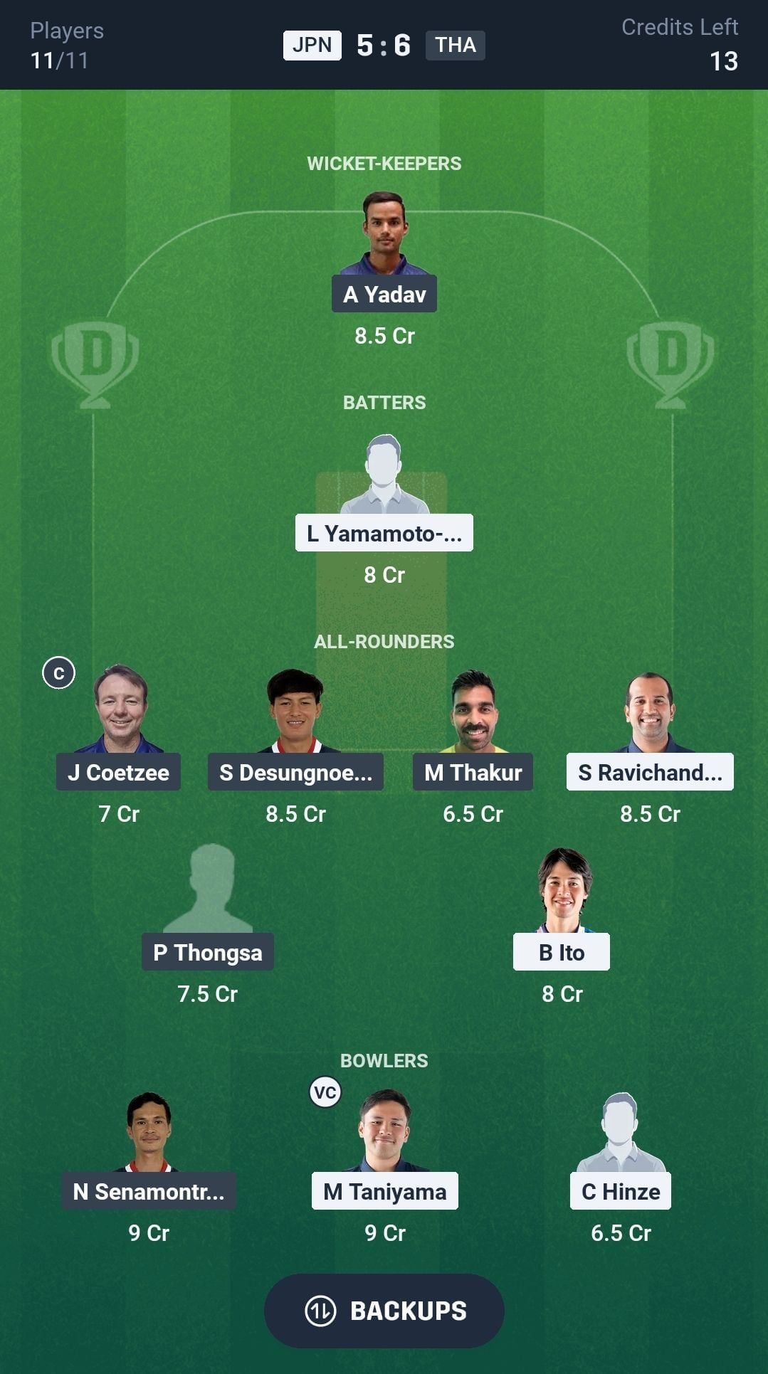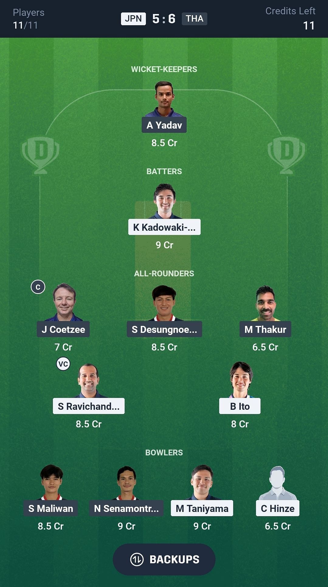 S Ravichandran is one of the most crucial picks from Japan as the pitch is expected to support batters. He will bat in the top order and complete his quota of overs in today's match. He has scored 43 runs and taken 2 wickets in the last two matches.