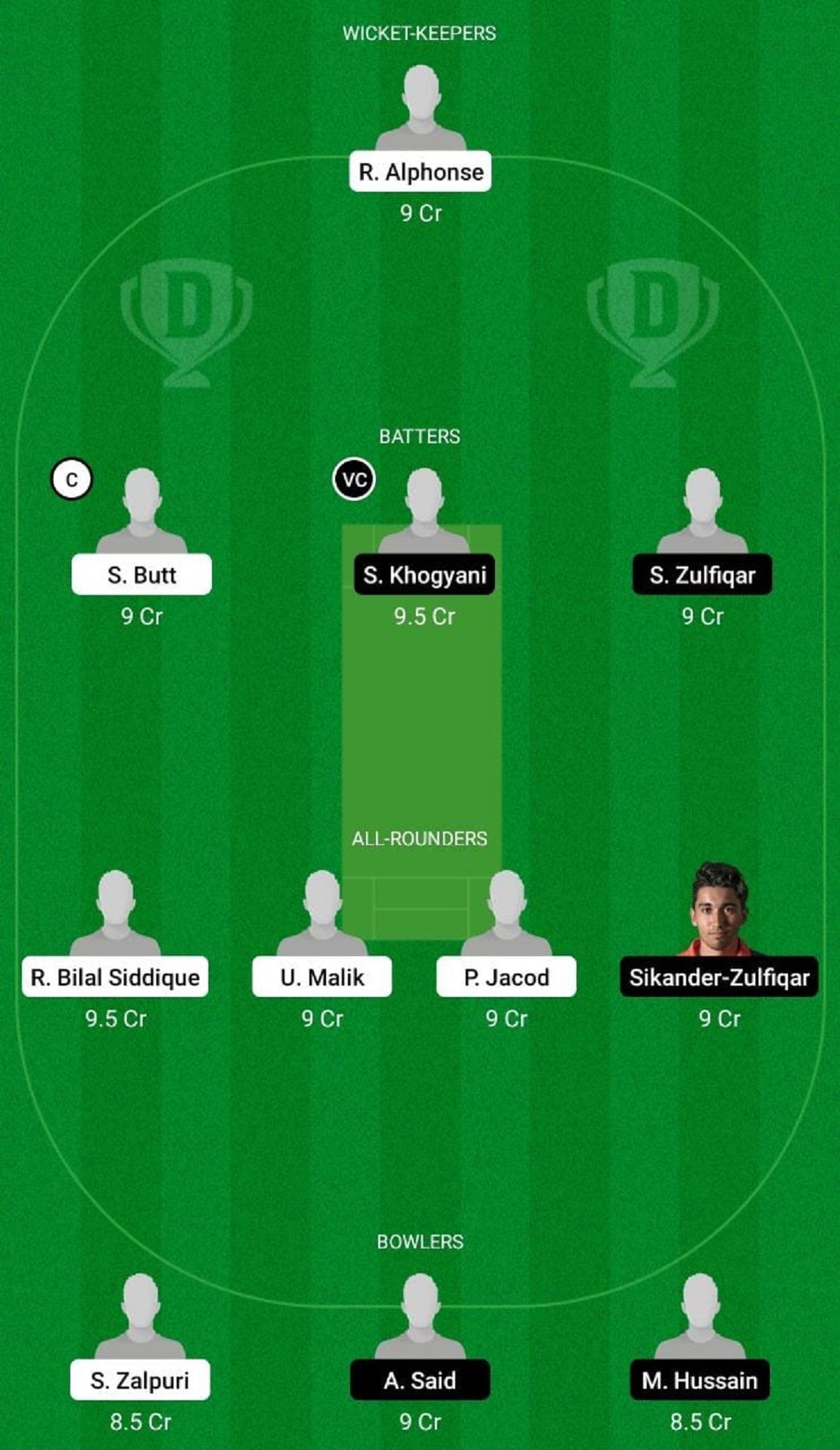 Captain: Sikander Zulfiqar. Vice-captain: U Malik.
