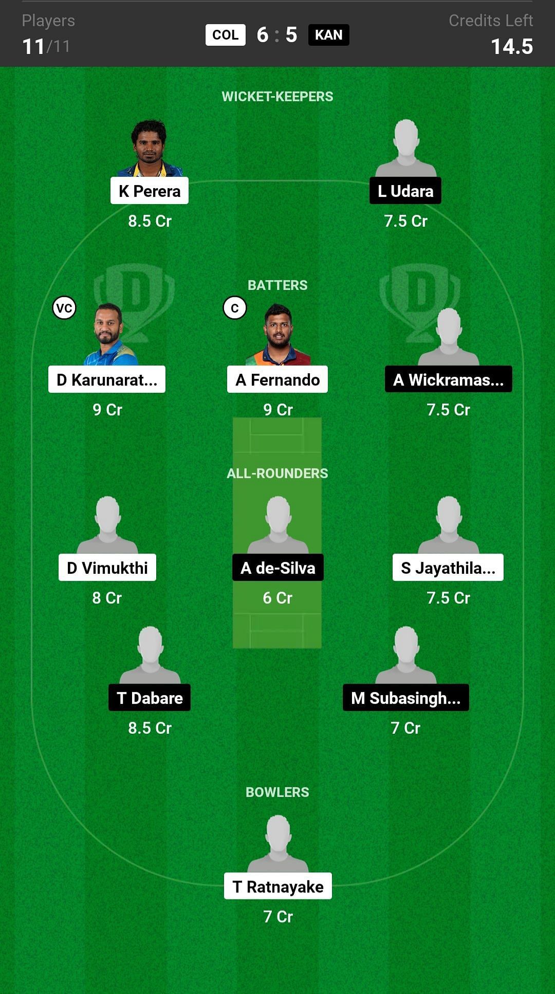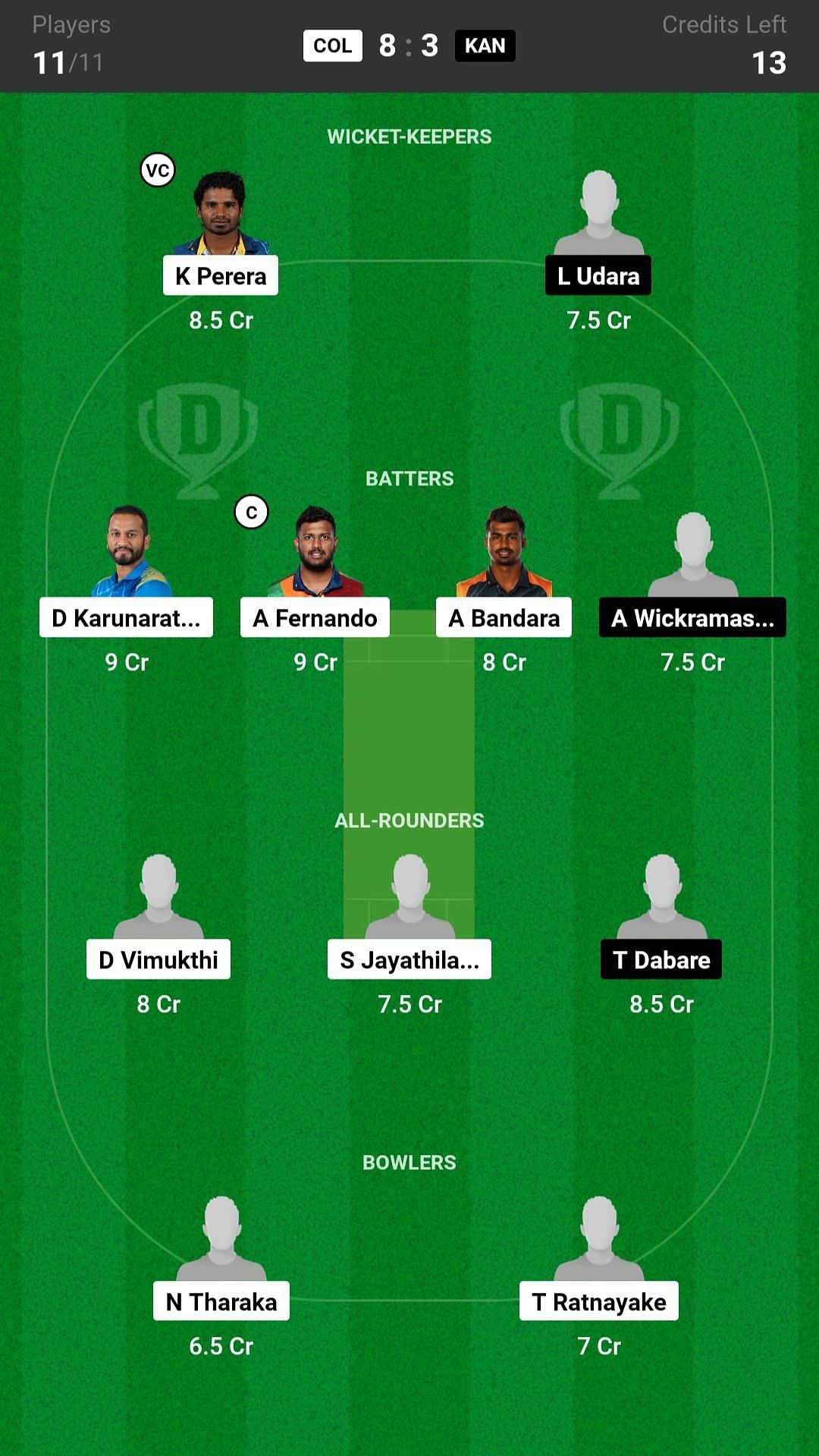 Since the pitch is well-balanced, you can make K Perera the captain as he will bat in the top order and also perform wicket-keeping duties. You can make him the captain of the grand league teams.