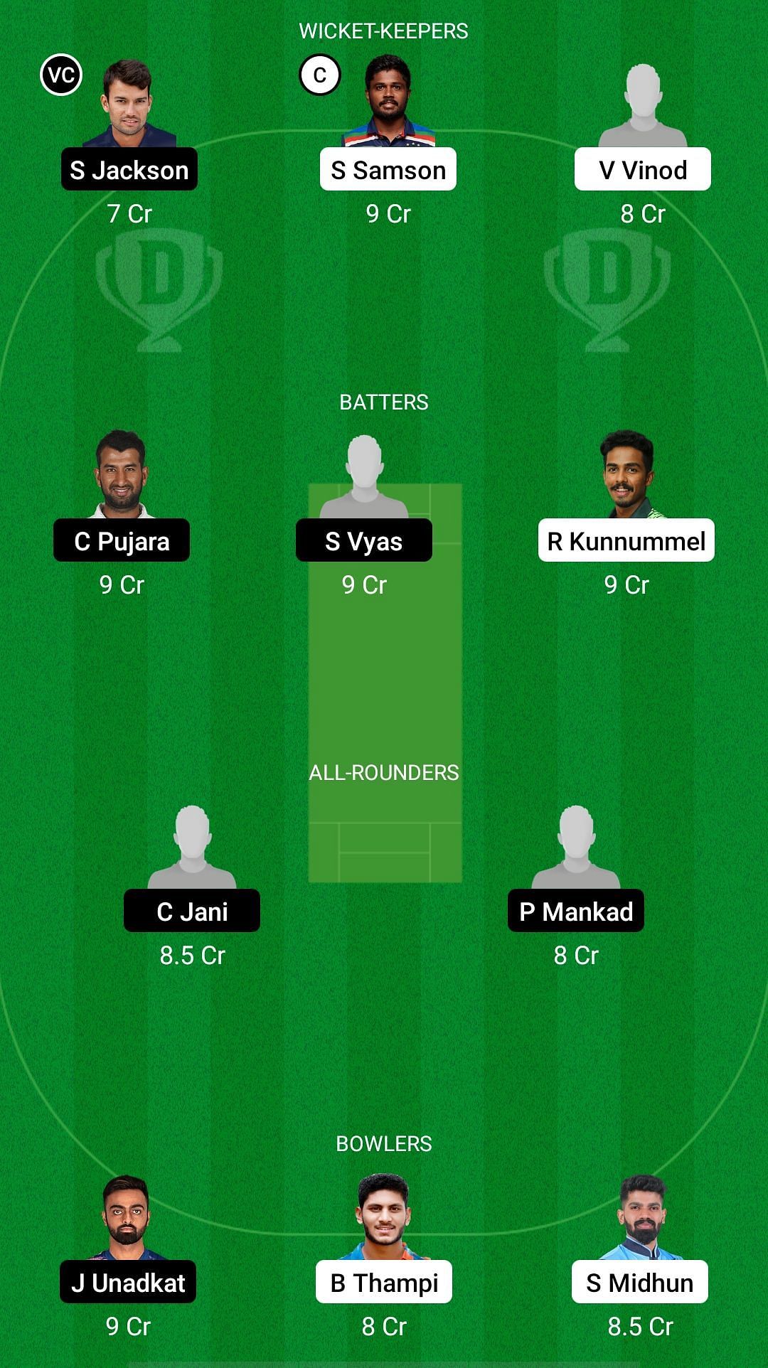 Batters: Cheteshwar Pujara, Samarth Vyas, Rohan Kunnummal