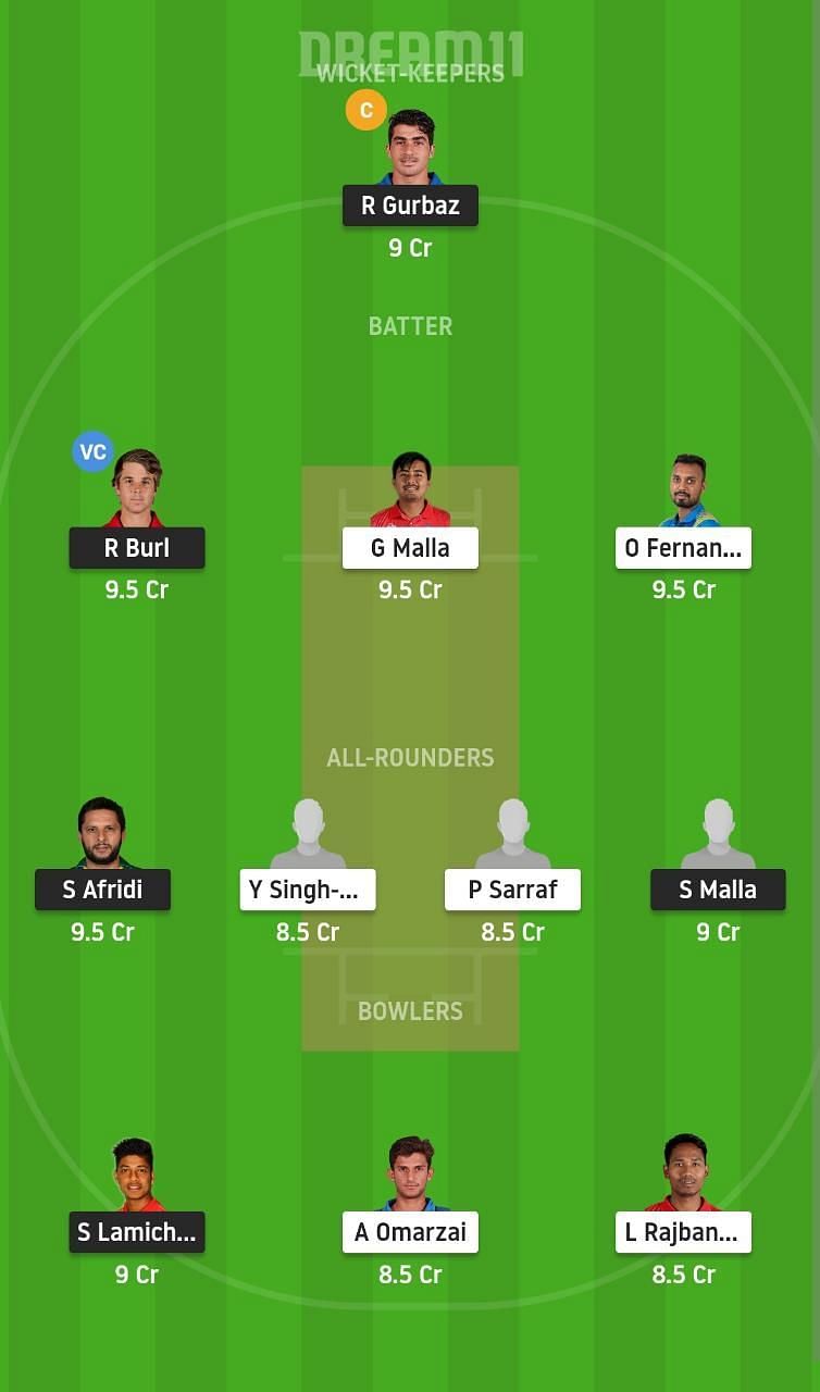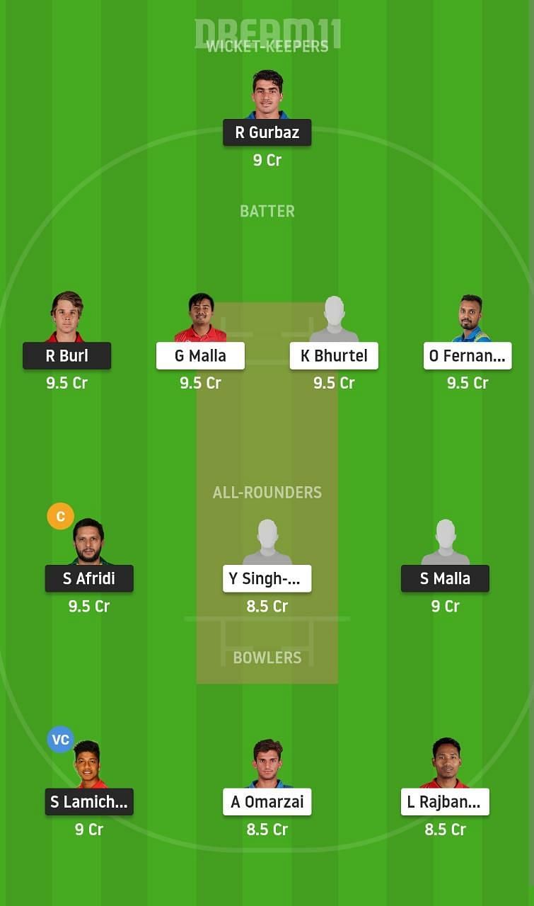 Fantasy Suggestion #2: Rahmanullah Gurbaz, Oshada Fernando, Gyanendra Malla, Ryan Burl, Sher Malla, Y Singh-Karki, Shahid Afridi, Pawan Sarraf, Lalit Rajbanshi, Azmatullah Omarzai, Sandeep Lamichhane