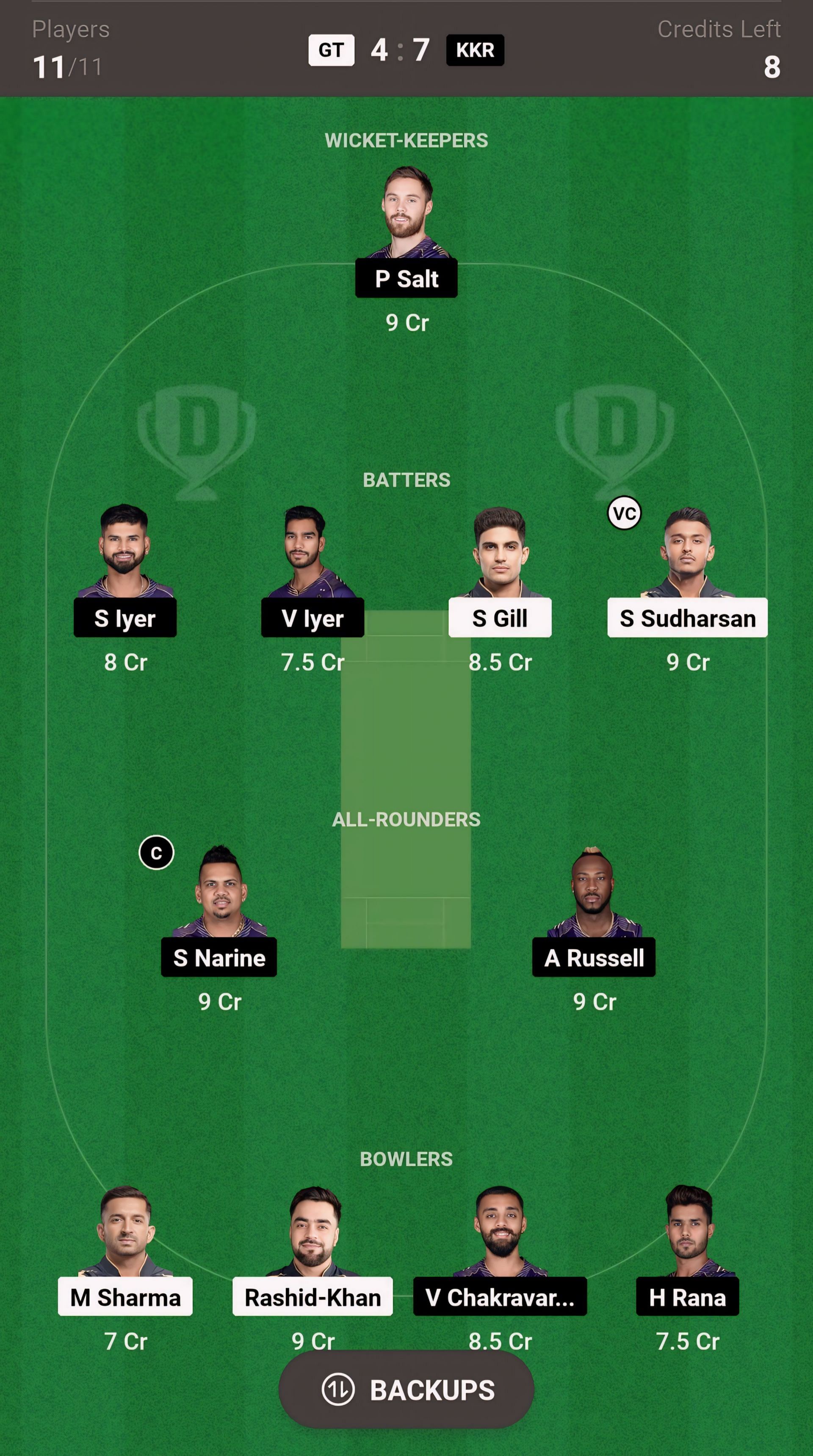 Philip Salt (wk), Sunil Narine, Shreyas Iyer (c), Venkatesh Iyer, Nitish Rana, Rinku Singh, Andre Russell, Ramandeep Singh, Mitchell Starc, Harshit Rana, Varun Chakravarthy, Vaibhav Arora