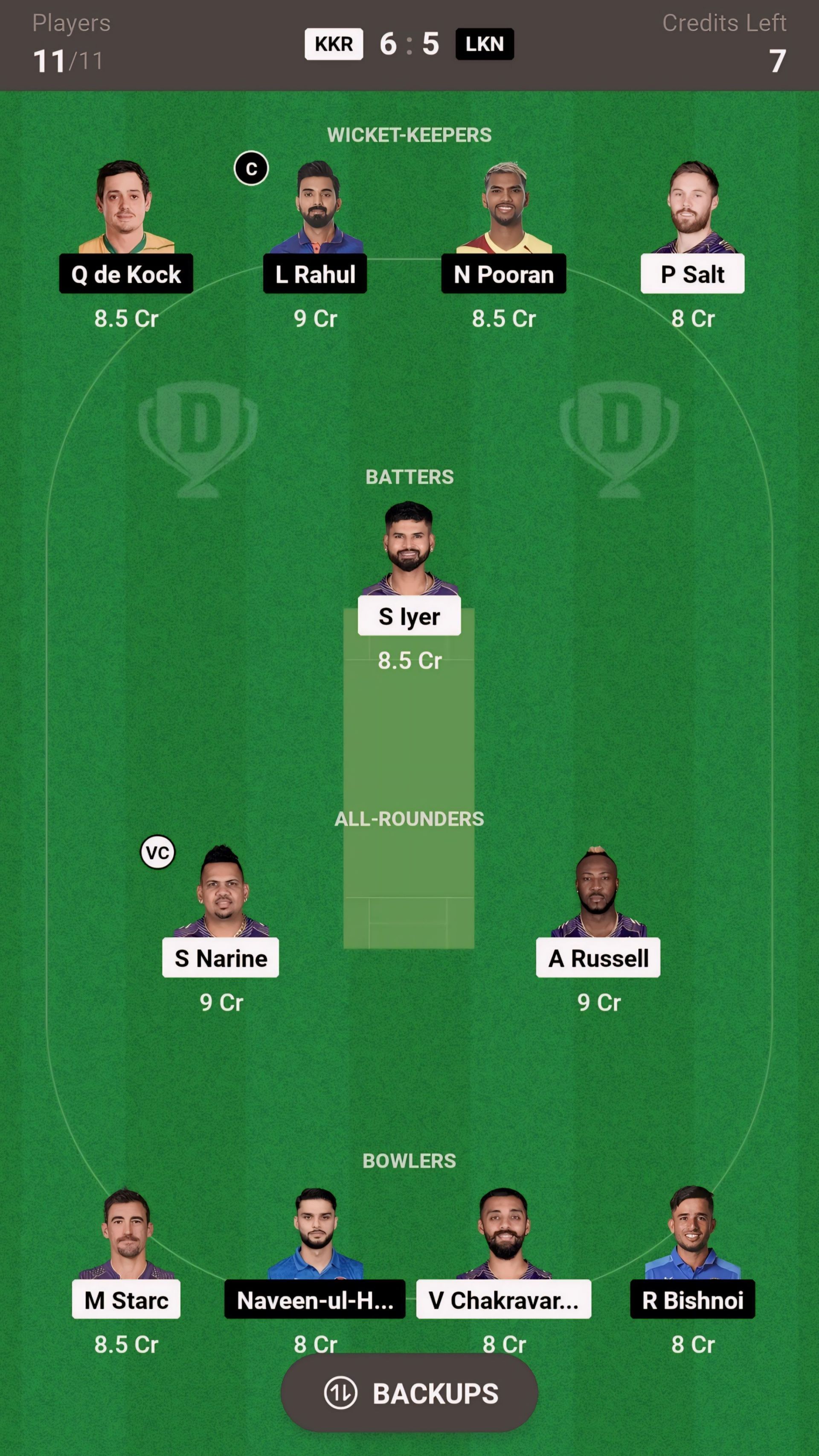 Phil Salt (wk), Sunil Narine, Venkatesh Iyer, Shreyas Iyer ©, Angkrish Raghuvanshi, Andre Russell, Rinku Singh, Ramandeep Singh, Mitchell Starc, Vaibhav Arora, Varun Chakaravarthy, Anukul Roy