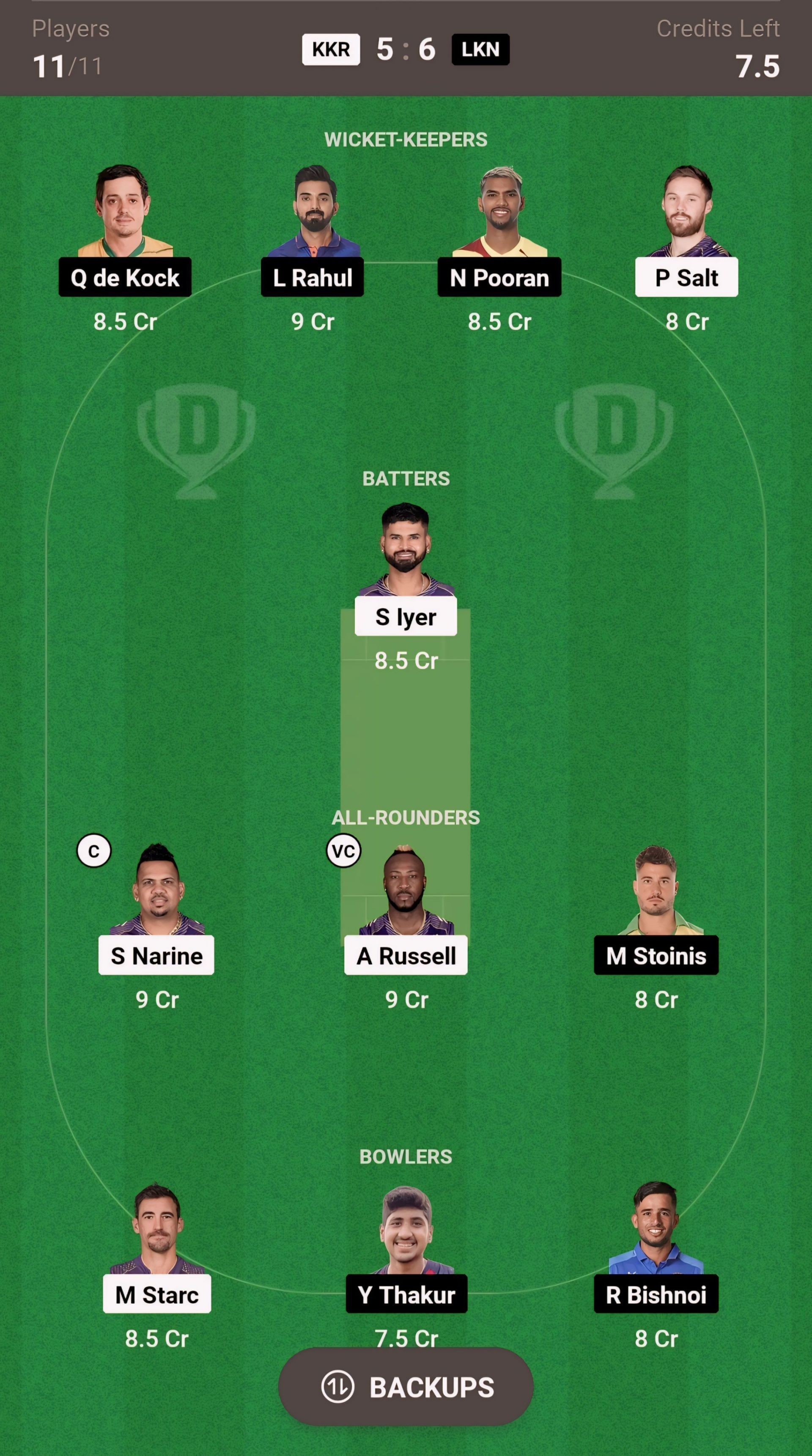 Kolkata Knight Riders vs Lucknow SuperGiants Dream11 Prediction Today, Grand League