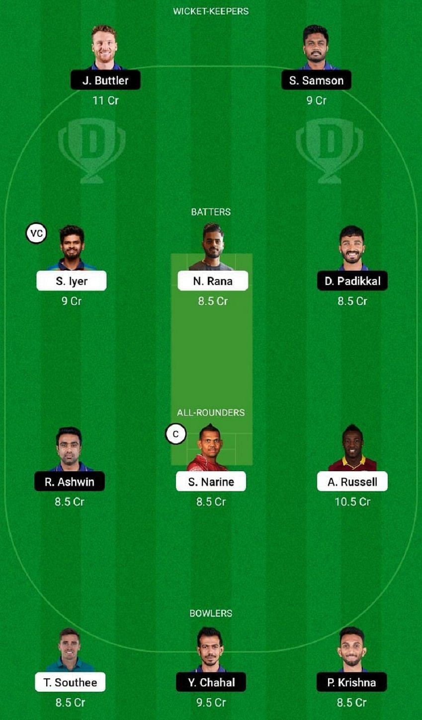Fantasy Suggestion #2: Jos Buttler, Sanju Samson, Shreyas Iyer, Devdutt Padikkal, Nitish Rana, Ravi Ashwin, Sunil Narine, Andre Russell, Tim Southee, Yuzvendra Chahal and Prasidh Krishna.