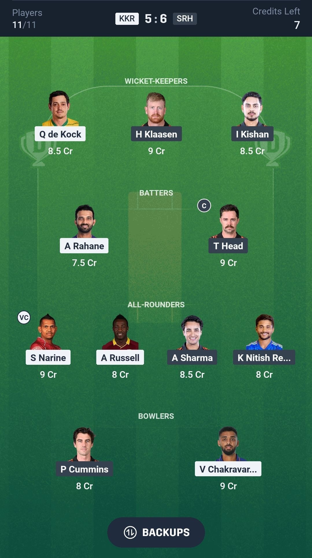 Sunil Narine, Quinton de Kock (wk), Ajinkya Rahane (c), Rinku Singh,Angkrish Raghuvanshi, Venkatesh Iyer, Andre Russell, Ramandeep Singh , Spencer Johnson, Harshit Rana, Varun Chakaravarthy