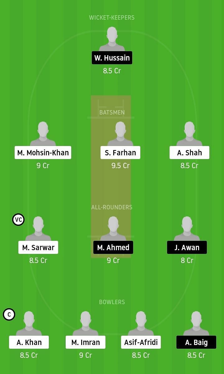 Fantasy Suggestion #1: W Hussain, M Mohsin Khan, S Farhan, A Shah, M Sarwar, M Ahmed, J Awan, A Khan, M Imran, A Afridi and A Baig.