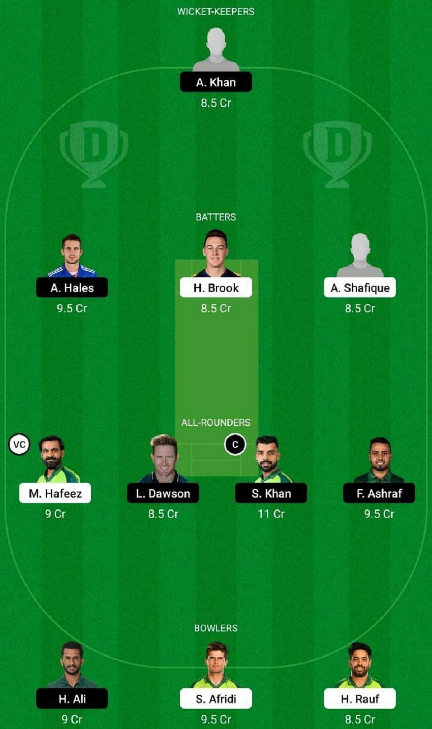 Fantasy Suggestion #2: Azam Khan, Alex Hales, Abdullah Shafique, Harry Brook, Faheem Ashraf, Mohammad Hafeez, Liam Dawson, Shadab Khan, Hasan Ali, Shaheen Afridi and Haris Rauf.