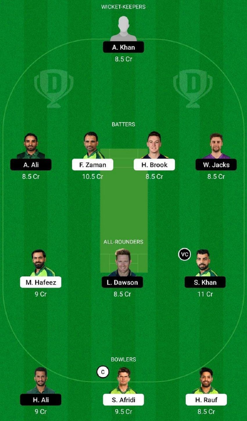 Fantasy Suggestion #1: Azam Khan, Asif Ali, Fakhar Zaman, Harry Brook, Will Jacks, Mohammad Hafeez, Liam Dawson, Shadab Khan, Hasan Ali, Shaheen Afridi and Haris Rauf