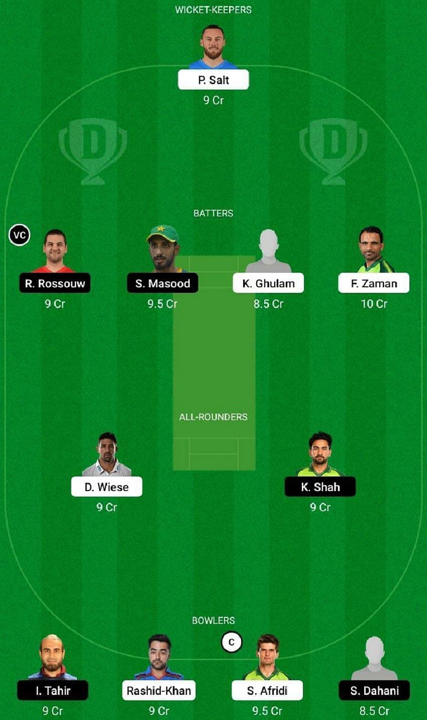 Fantasy Suggestion #2: Phil Salt, Rilee Rossouw, Kamran Ghulam, Shan Masood, Fakhar Zaman, David Wiese, Khushdil Shah, Imran Tahir, Shaheen Afridi, Rashid Khan and Shahnawaz Dahani