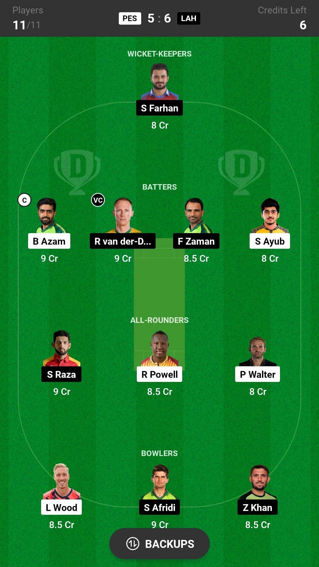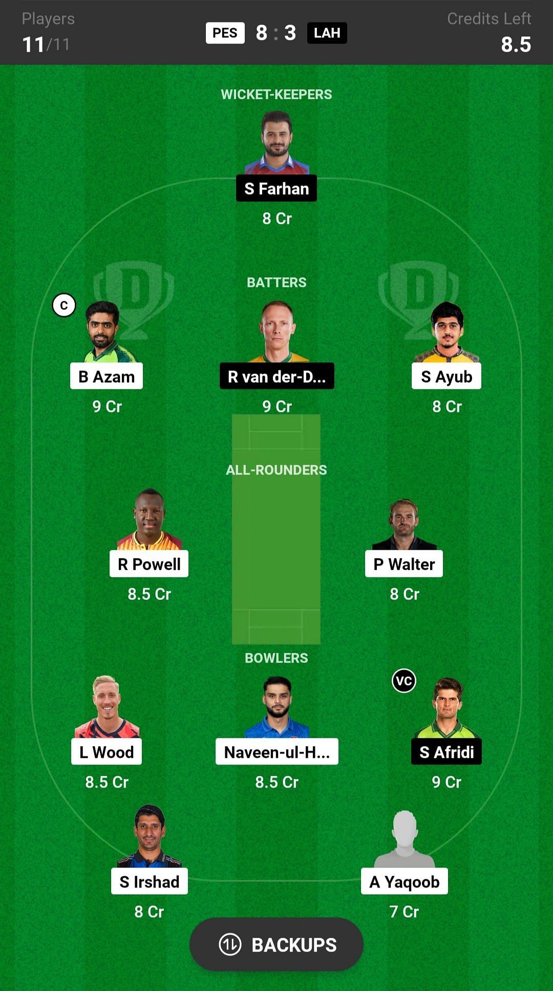 Saim Ayub, Babar Azam (c), Mohammad Haris (wk), Tom Kohler Cadmore, Rovman Powell, Asif Ali, Aamer Jamal, Luke Wood, Mohammad Zeeshan, Waqar Salamkheil, Salman Irshad