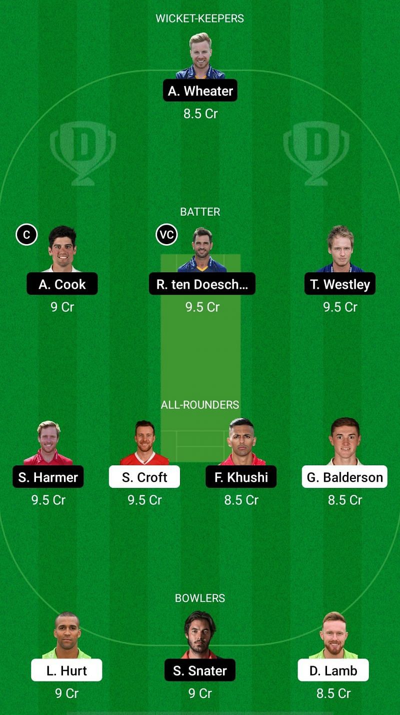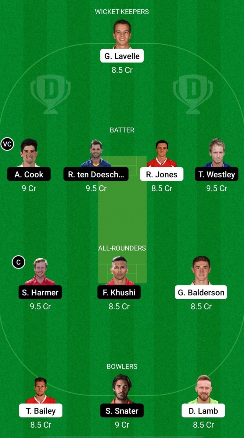 Fantasy Suggestion #1: George Lavelle, Sir Alastair Cook, Ryan ten Doeschate, Rob Jones, Tom Westley, Simon Harmer, Feroze Khushi, George Balderson, Tom Bailey, Shane Snater, Danny Lamb.