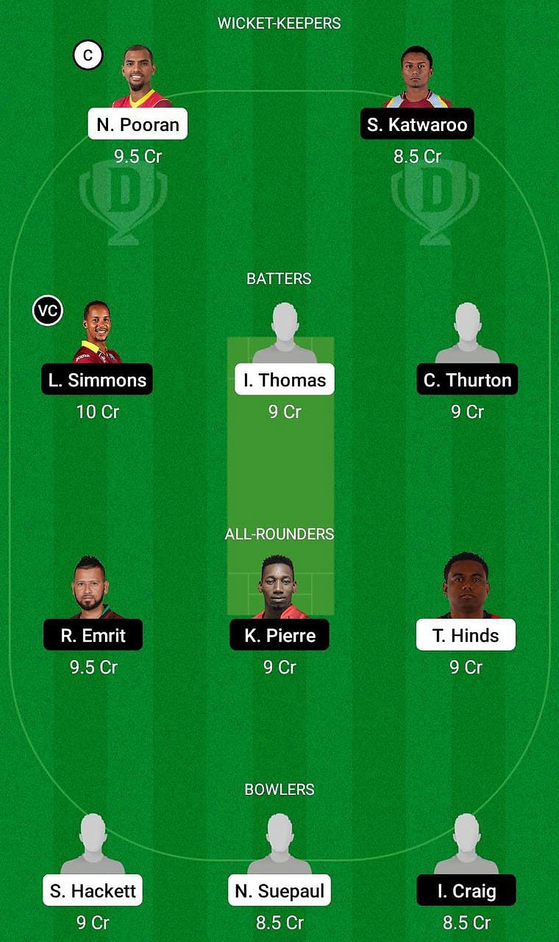 Fantasy Suggestion #1: Crystian Thurton, Iraq Thomas, Lendl Simmons, Nicholas Pooran, Khary Pierre, Rayad Emrit, Terrance Hinds, Sion Hackett, Namir Suepaul, Iqwe Craig, Shaaron Lewis.