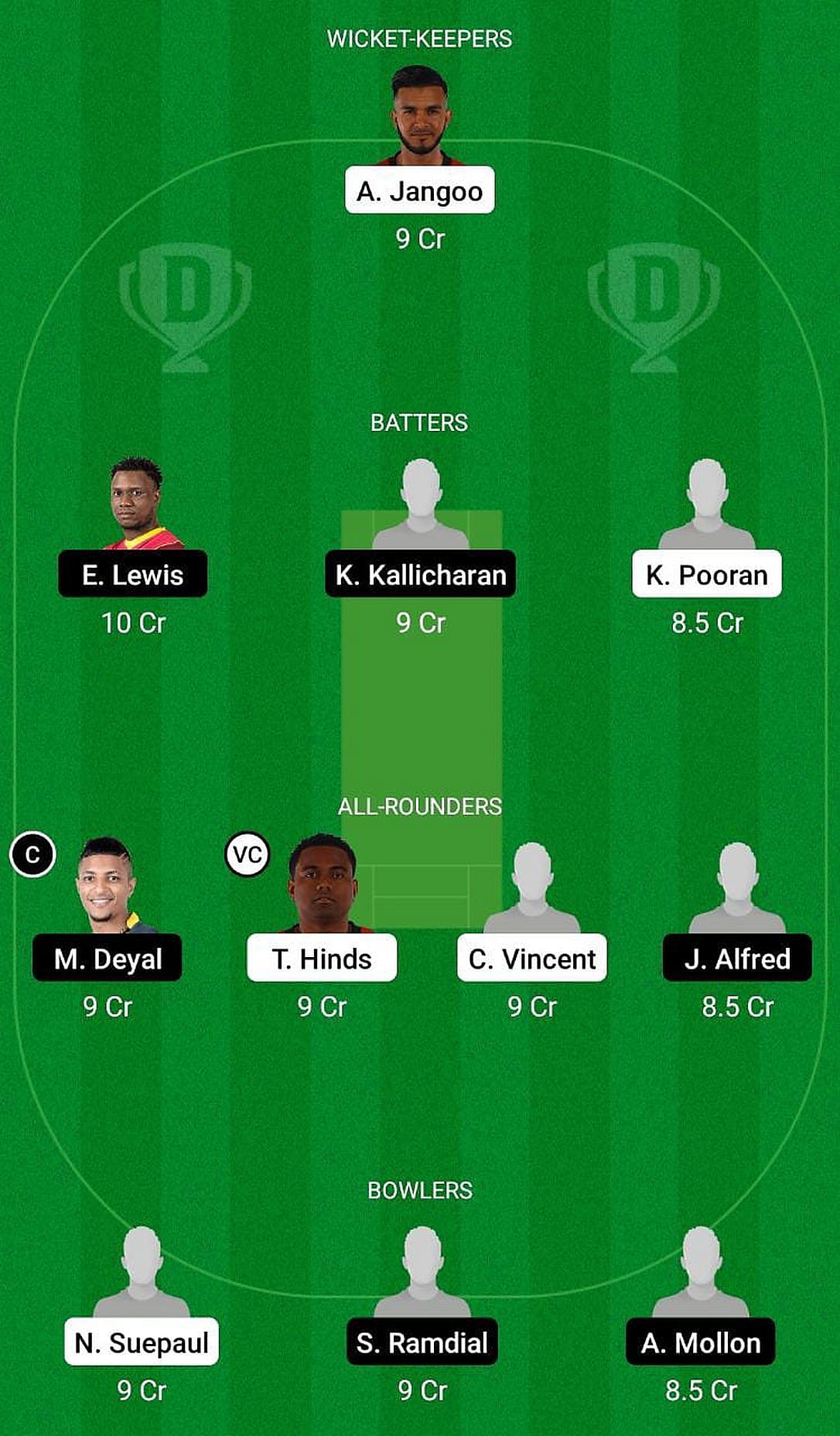 Fantasy Suggestion #2: Amir Jangoo, Evin Lewis, Kirstan Kallicharan, Kamil Pooran, Mark Deyal, Terrance Hinds, Christopher Vincent, Jahron Alfred, Namir Suepaul, Vikash Mohan, Stephon Ramdial.