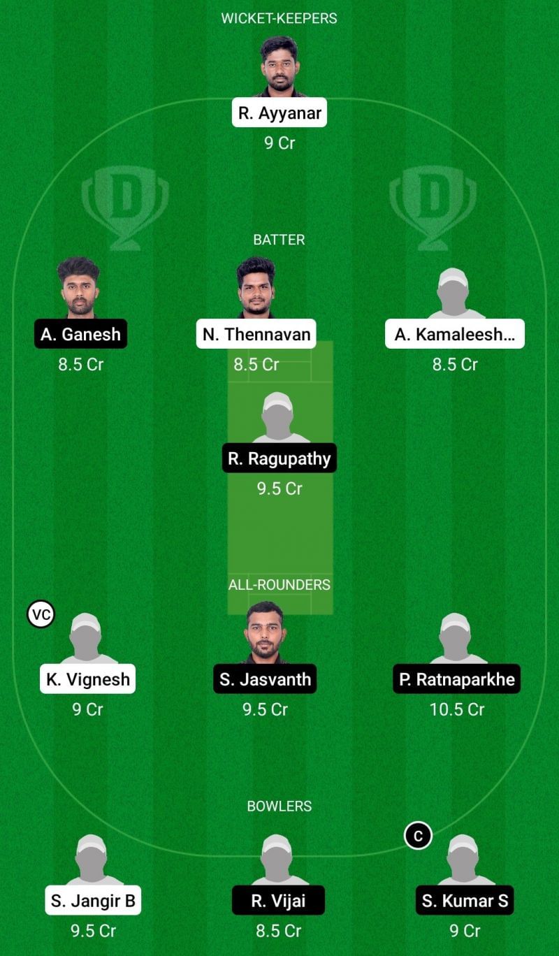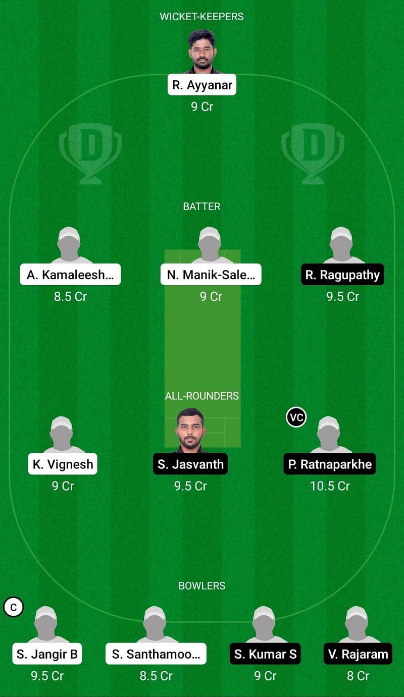 Fantasy Suggestion #1: R Ayyanar, A Kamaleeshwaran, Nitish Manik Salekar, R Ragupathy, Kannan Vignesh, S Jasvanth, Paras Ratnaparkhe, Satish Jangir B, SanthaMoorthy, Siva Kumar, Vijay Raja