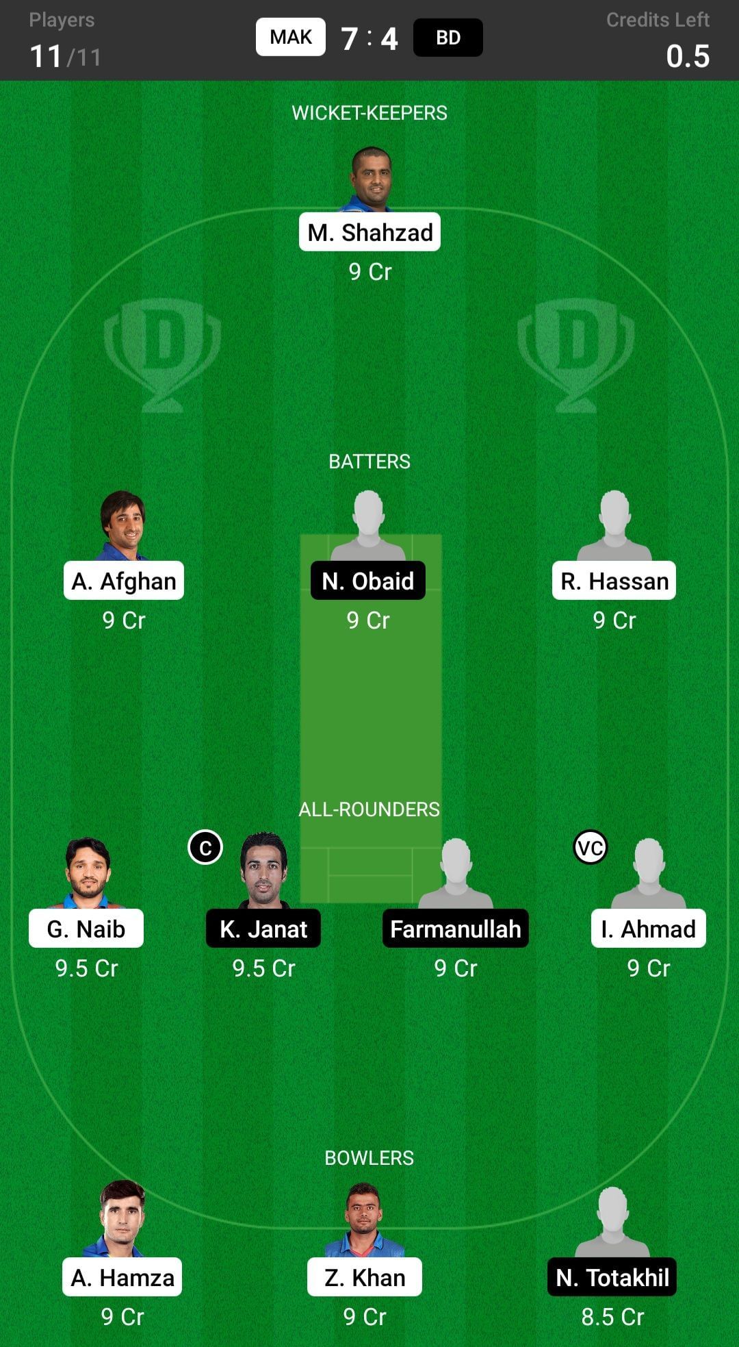 Fantasy suggestion #1: M Shahzad, A Afghan, R Hassan, N Obaid, K Janat, I Ahmad, G Naib, Farmanullah, Z Khan, N Totakhil, A Hamza