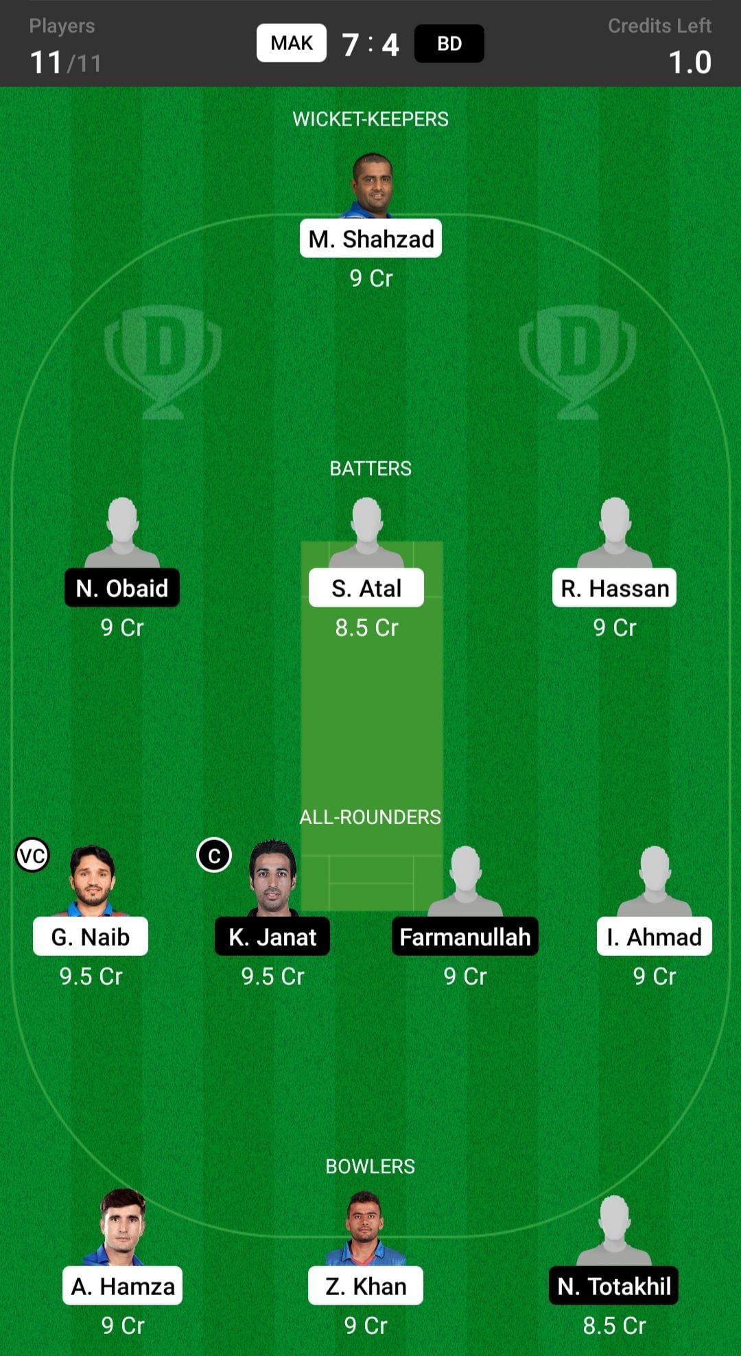 Fantasy suggestion #2: M Shahzad, S Atal, R Hassan, N Obaid, K Janat, I Ahmad, G Naib, Farmanullah, Z Khan, N Totakhil, A Hamza