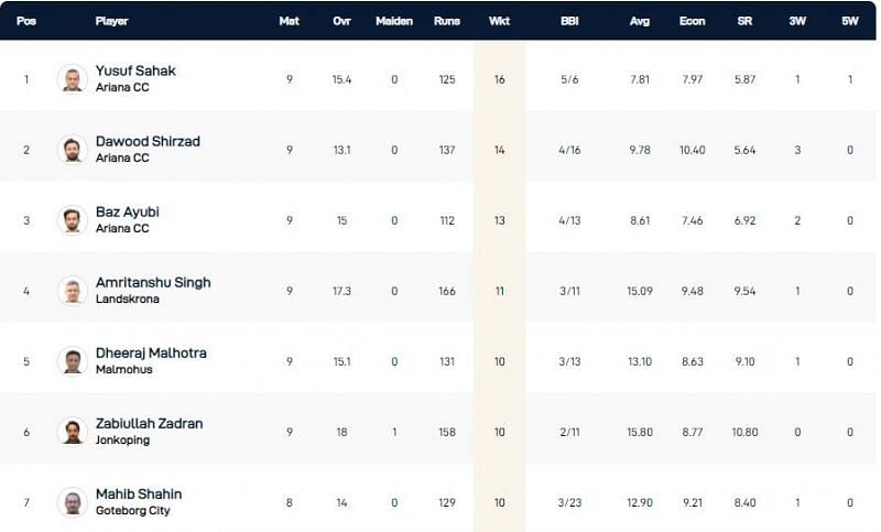 Malmo's Azim Chinwari (10), Musadaq Mubarak (9) and Qaiser Munir (9), Goteborg City's Mahib Shahin (10) and Rahim Safi (6), and Ariana AKIF's Delawar Khan (7) and Dharmender Singh (7) are the most successful bowlers from their respective sides.