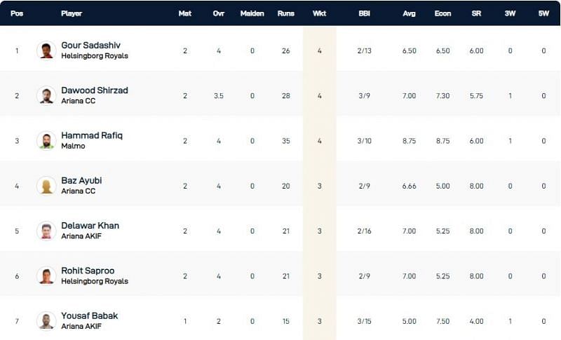 The Helsingborg Royals' Sadashiv has 2/13 as his best performance and has an excellent economy of 6.50. Ariana CC's Shirzad has 3/9 as his best effort and has conceded an average of 7.30 runs per over. Malmo's Rafiq has a best spell of 3/10 and has an acceptable economy of 8.75.