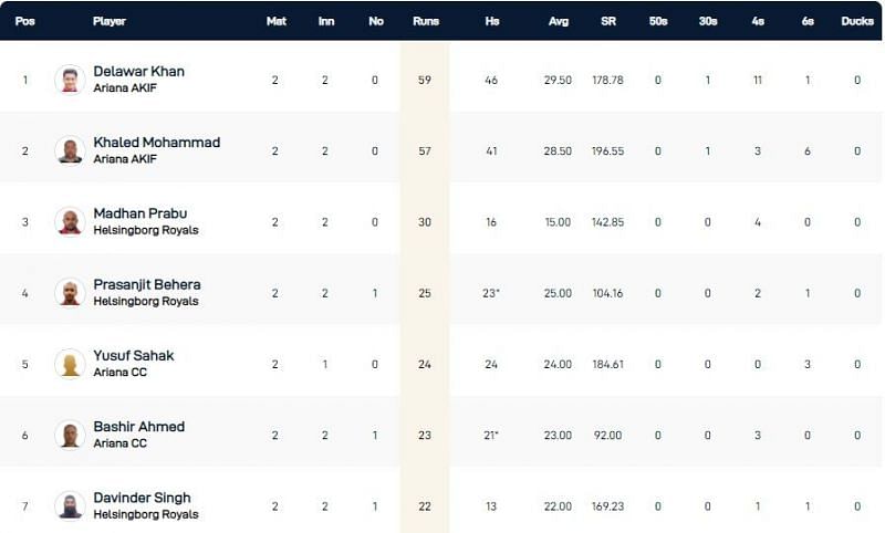 Delawar Khan of Ariana AKIF is the highest run-scorer after the first day of action in the Malmo T10 League 2021. He has amassed 59 runs in two matches, with 46 being his highest score. Khan's runs have come at an impressive strike rate of 178.78, and are studded with 11 fours and a solitary six.